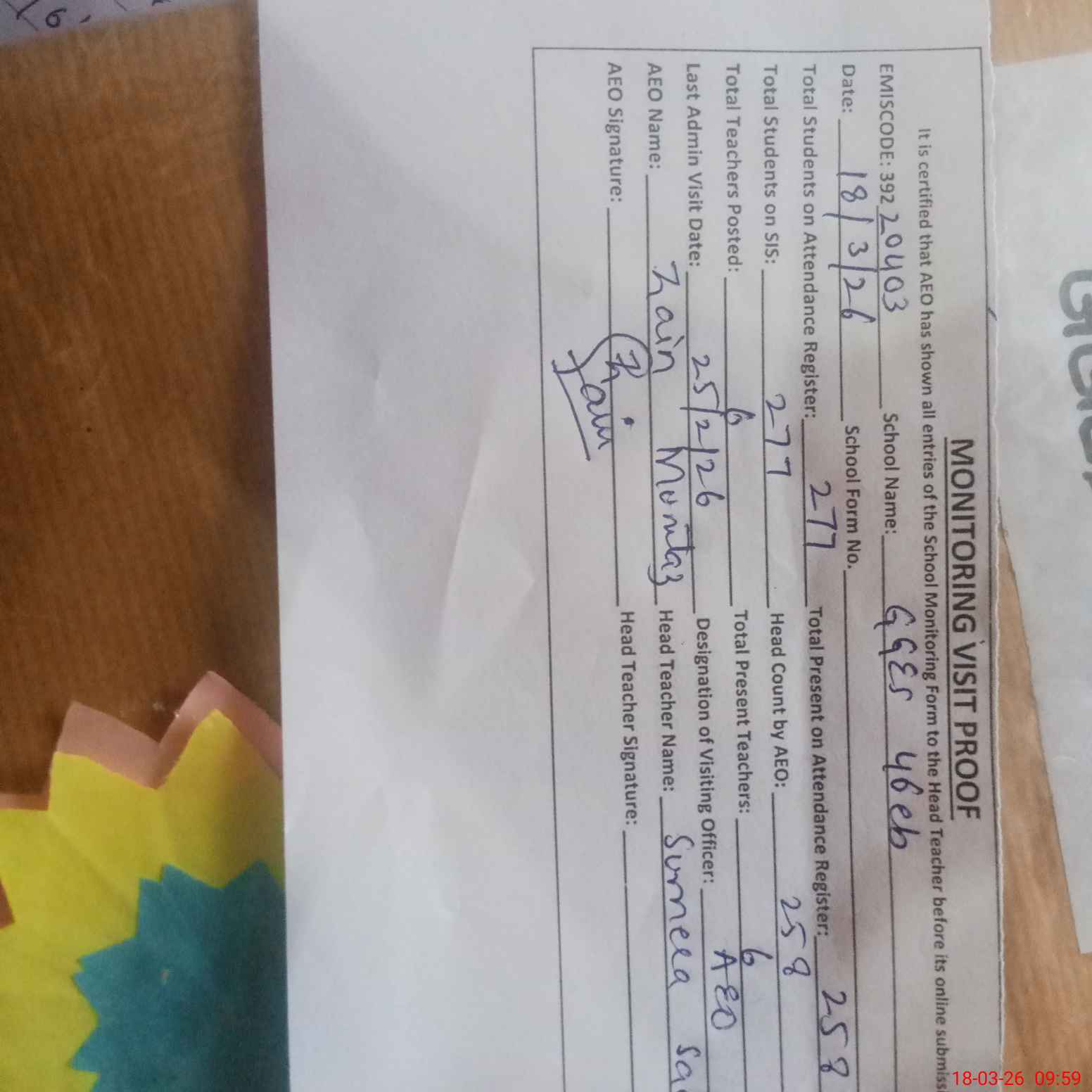 | Attendance Register | Head Teacher | MEA with School | Visit Proof |