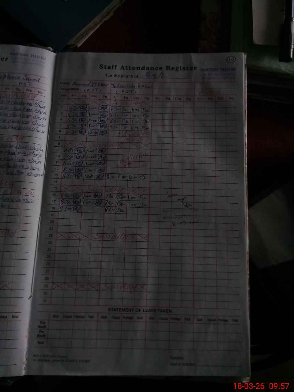 | CNIC | Full Name | Designation | R/C | Absence During Last Calender Month |