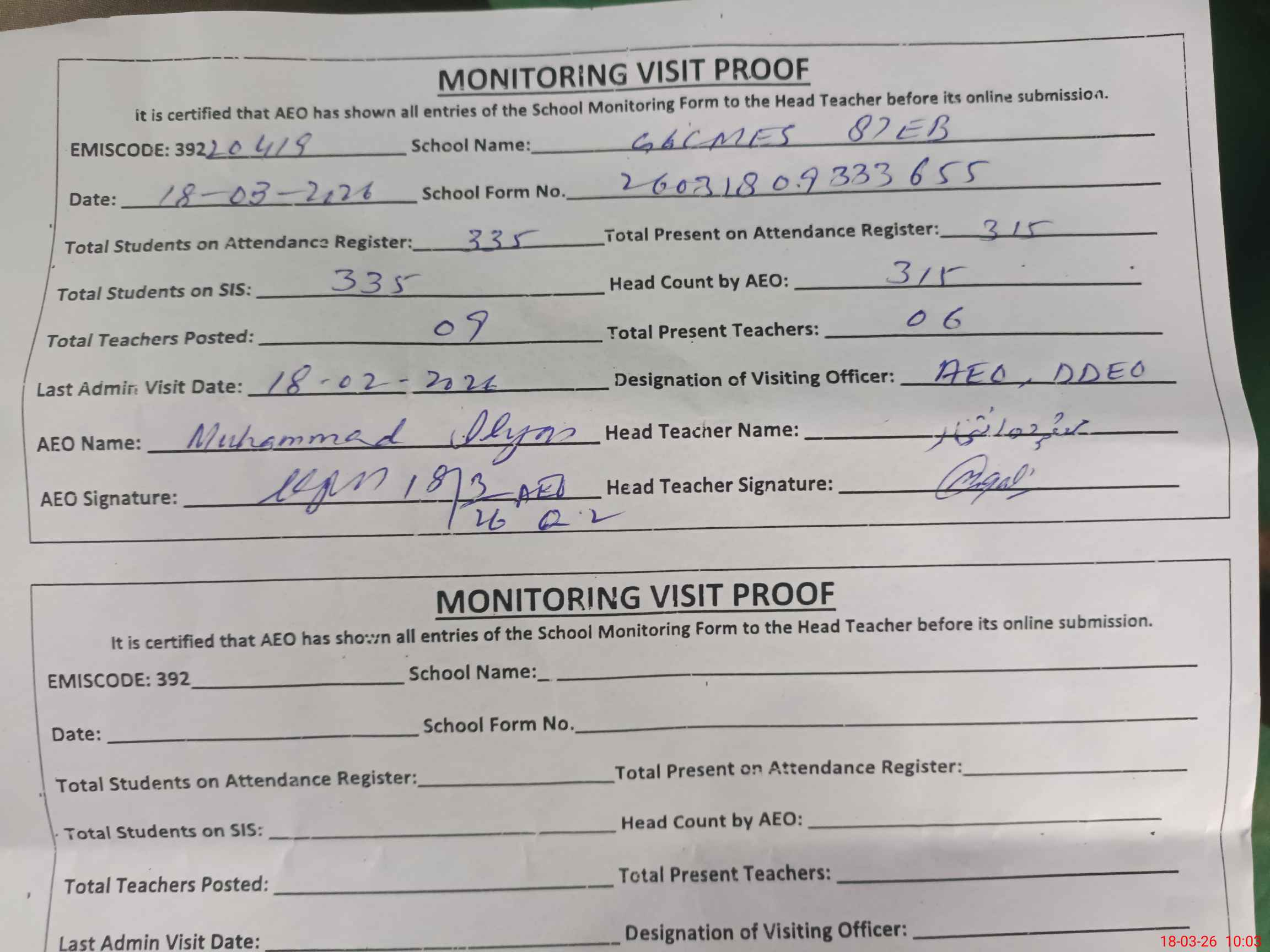 | Certified that this School was Inspected by the Undersigned MEA/DMO Today and the Information Stated Above is as Per Record. | |||||
