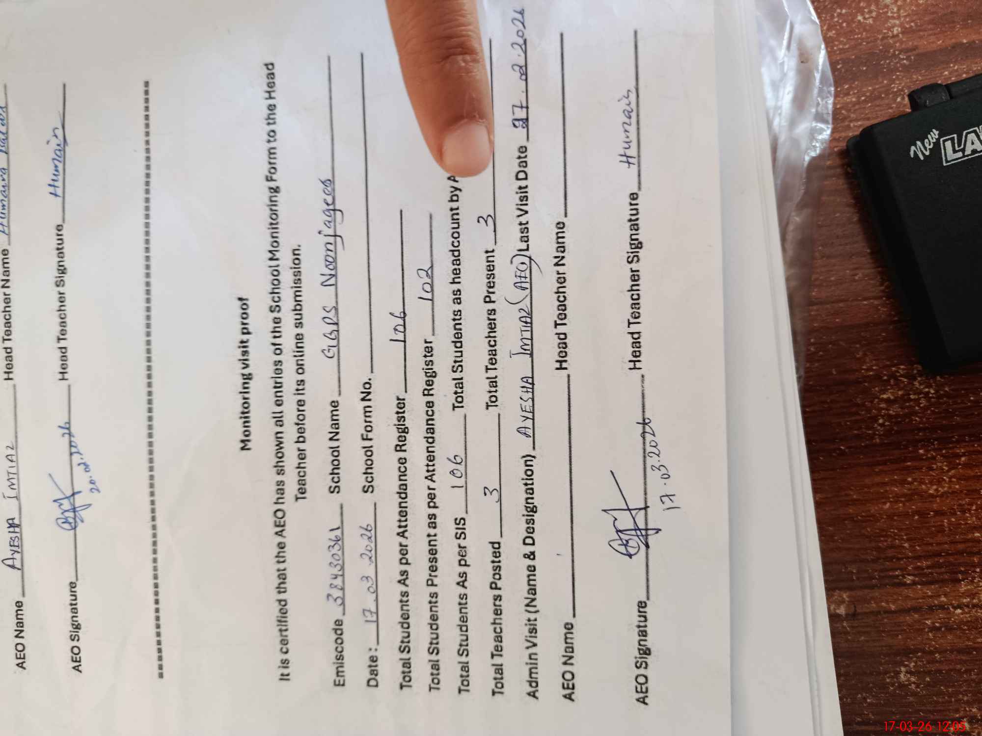| Attendance Register | Head Teacher | MEA with School | Visit Proof |