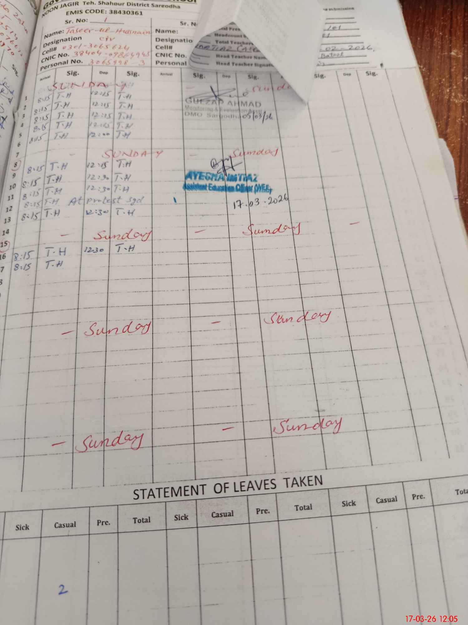 | CNIC | Full Name | Designation | R/C | Absence During Last Calender Month |