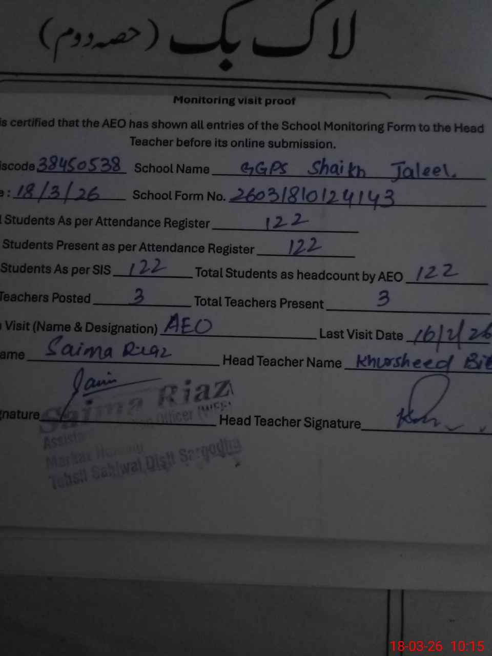| Name: KH**** BI**** Designation: (School Headmaster's/Headmistress's) PST Phone/Cell Number: 03**** |