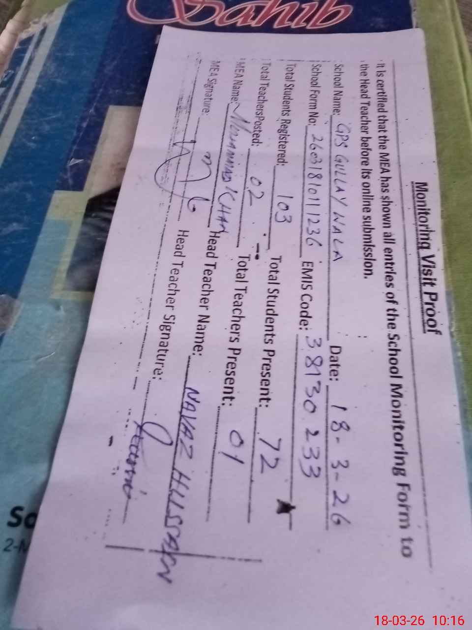 | Attendance Register | Head Teacher | MEA with School | Visit Proof |