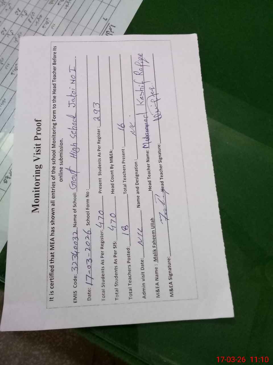 | Attendance Register | Head Teacher | MEA with School | Visit Proof |