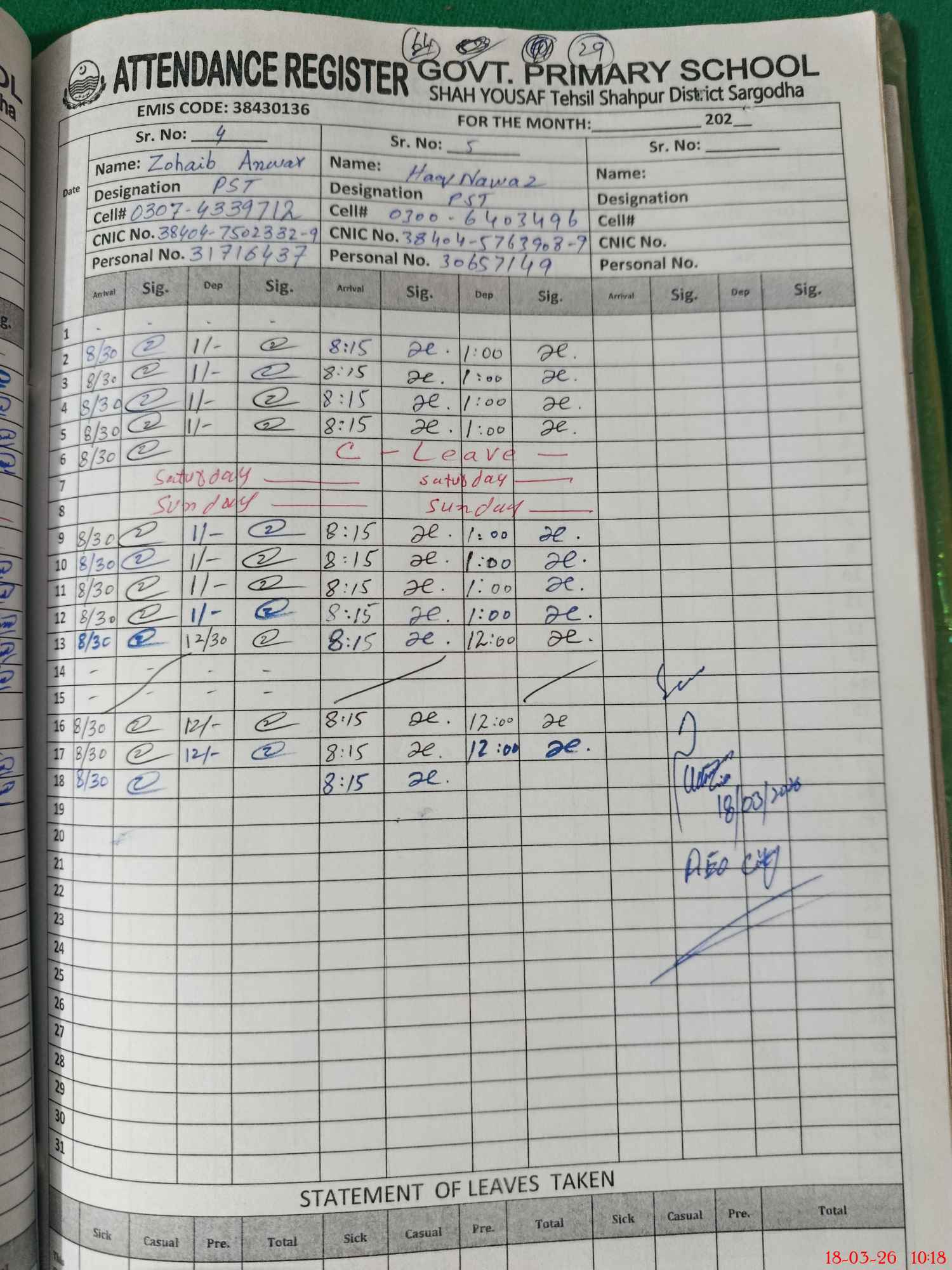 | Name: SA**** URRE**** Designation: (School Headmaster's/Headmistress's) PST Phone/Cell Number: 03**** |