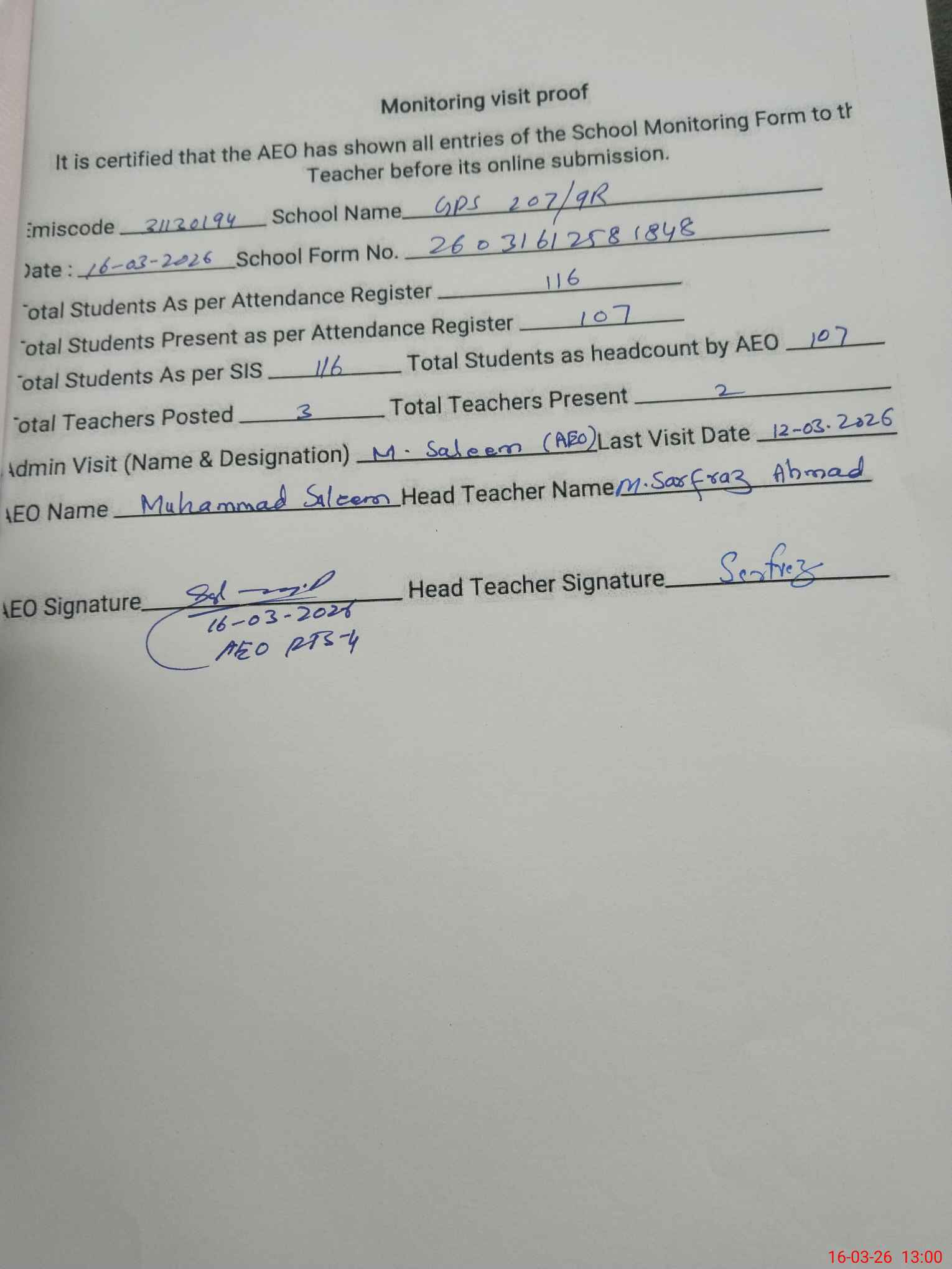 | EMIS Code: 31130194 | Name of School: GPS CHAK 207/9-R | |||