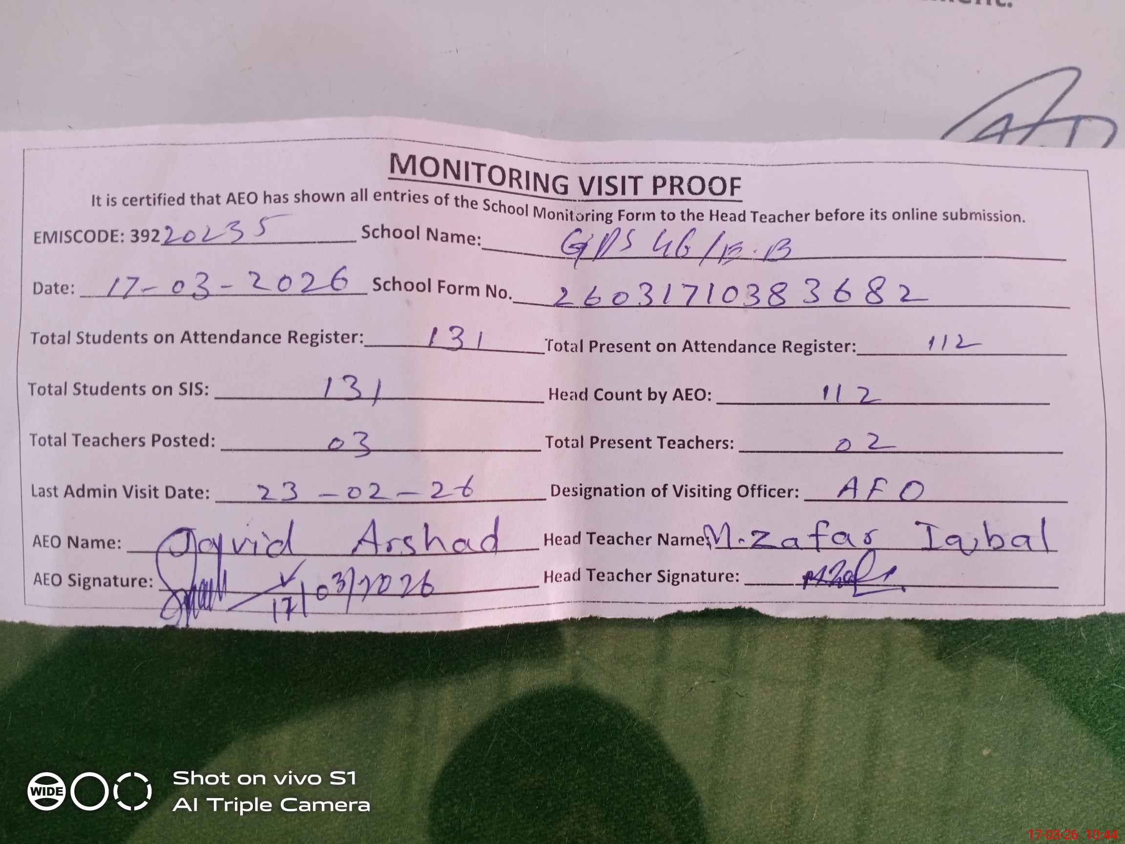 | Attendance Register | Head Teacher | MEA with School | Visit Proof |