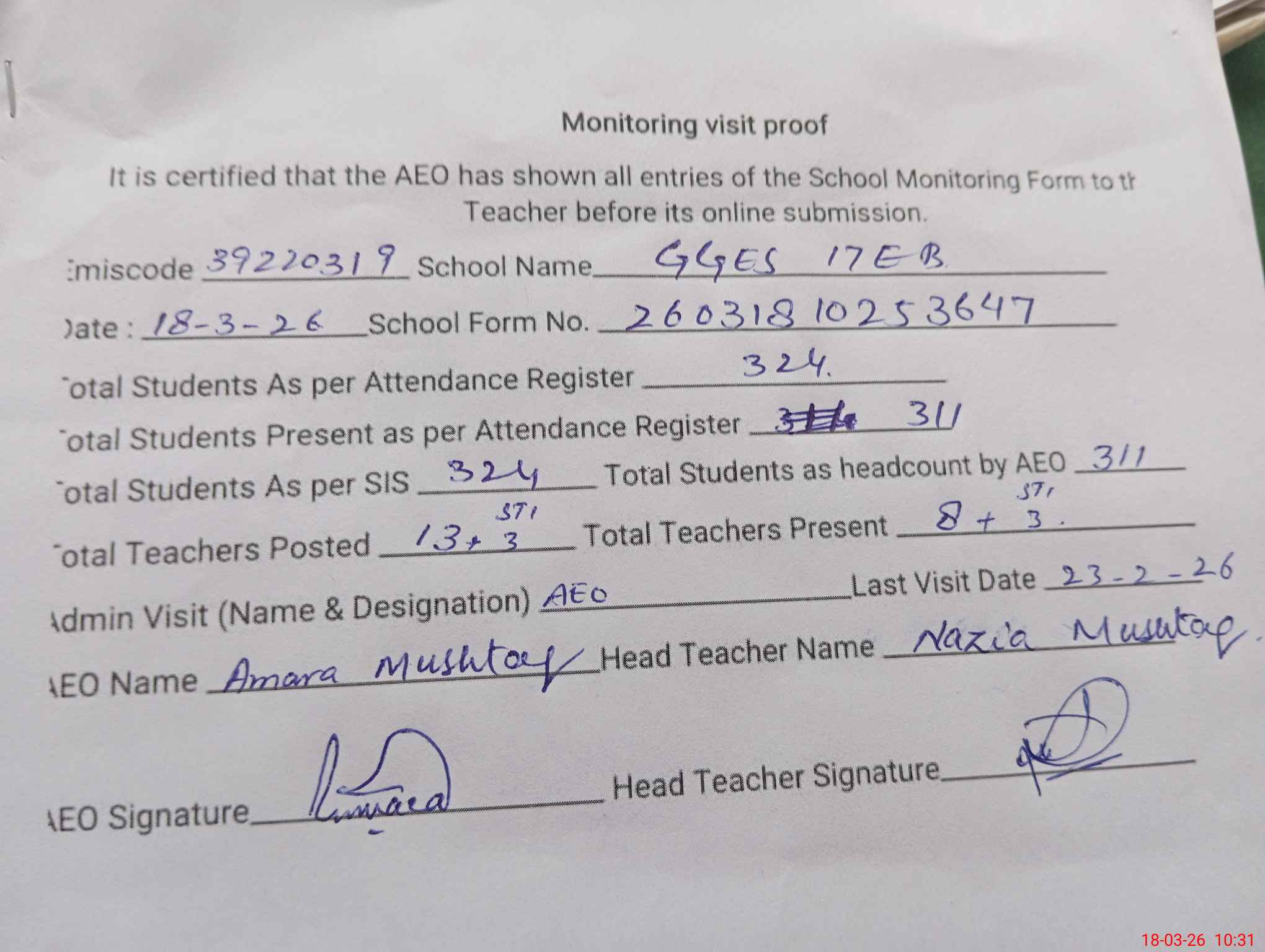| Attendance Register | Head Teacher | MEA with School | Visit Proof |