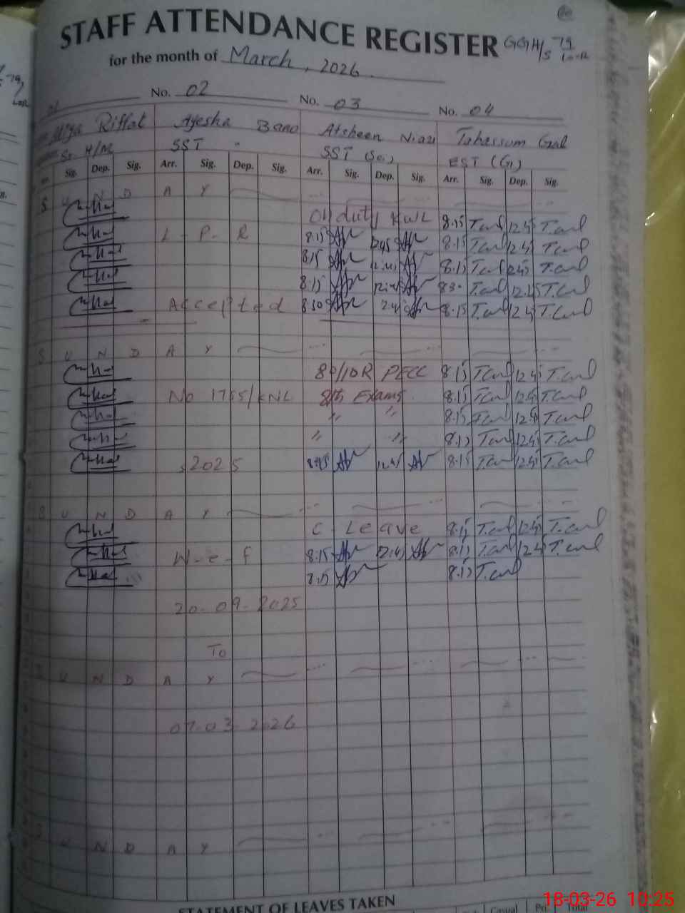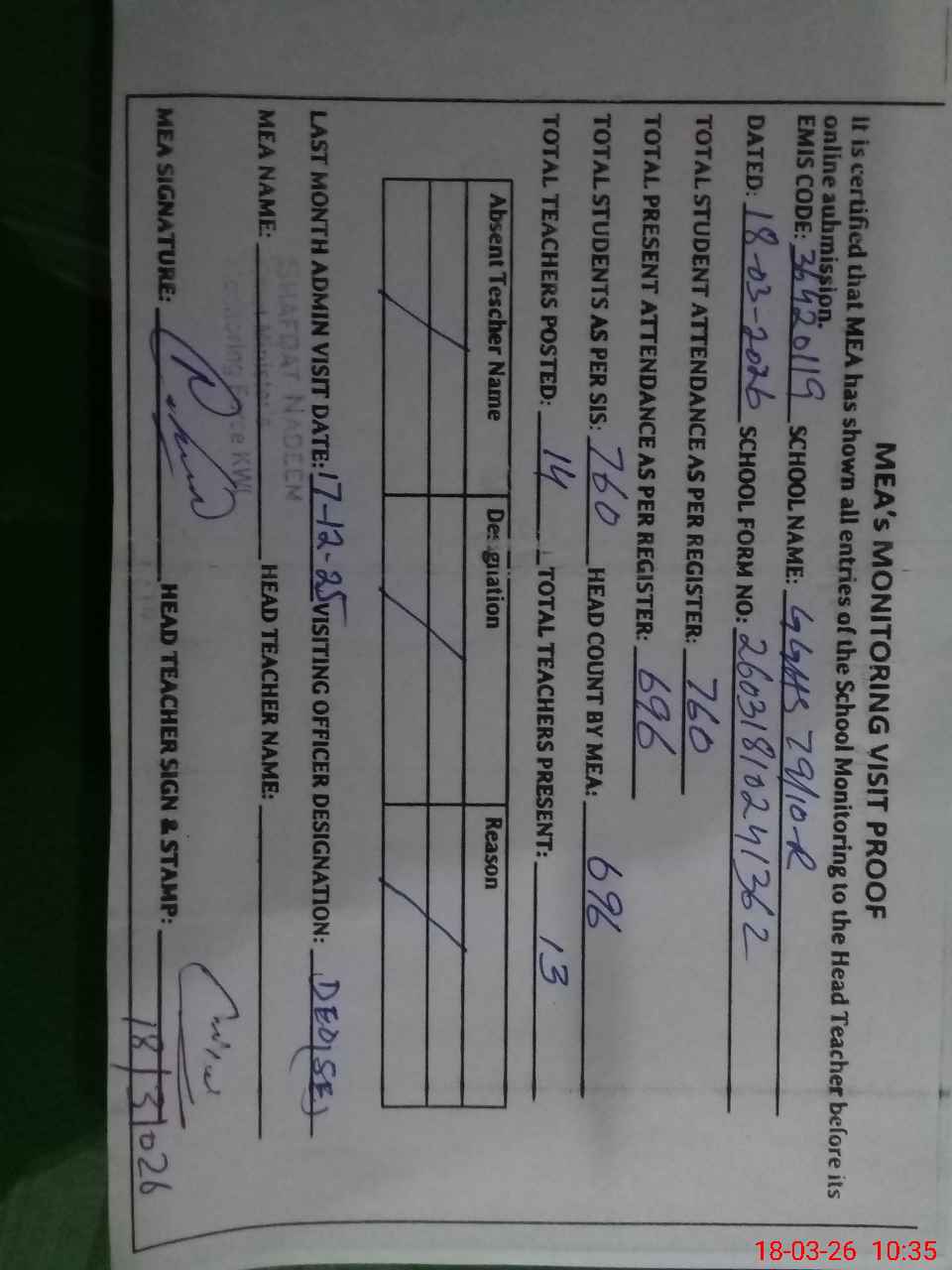 | Remarks (Use Separate Page if Required): 1 . ECE, Nursery, 1 and 2 classes exam completed attendence taken from roznamcha 2. 9th and 10th classes free for board exam attendence taken from roznamcha 3. 02 toilets are nonfunctional saverag line blocked 4 . 03 STI present in the school | |||||