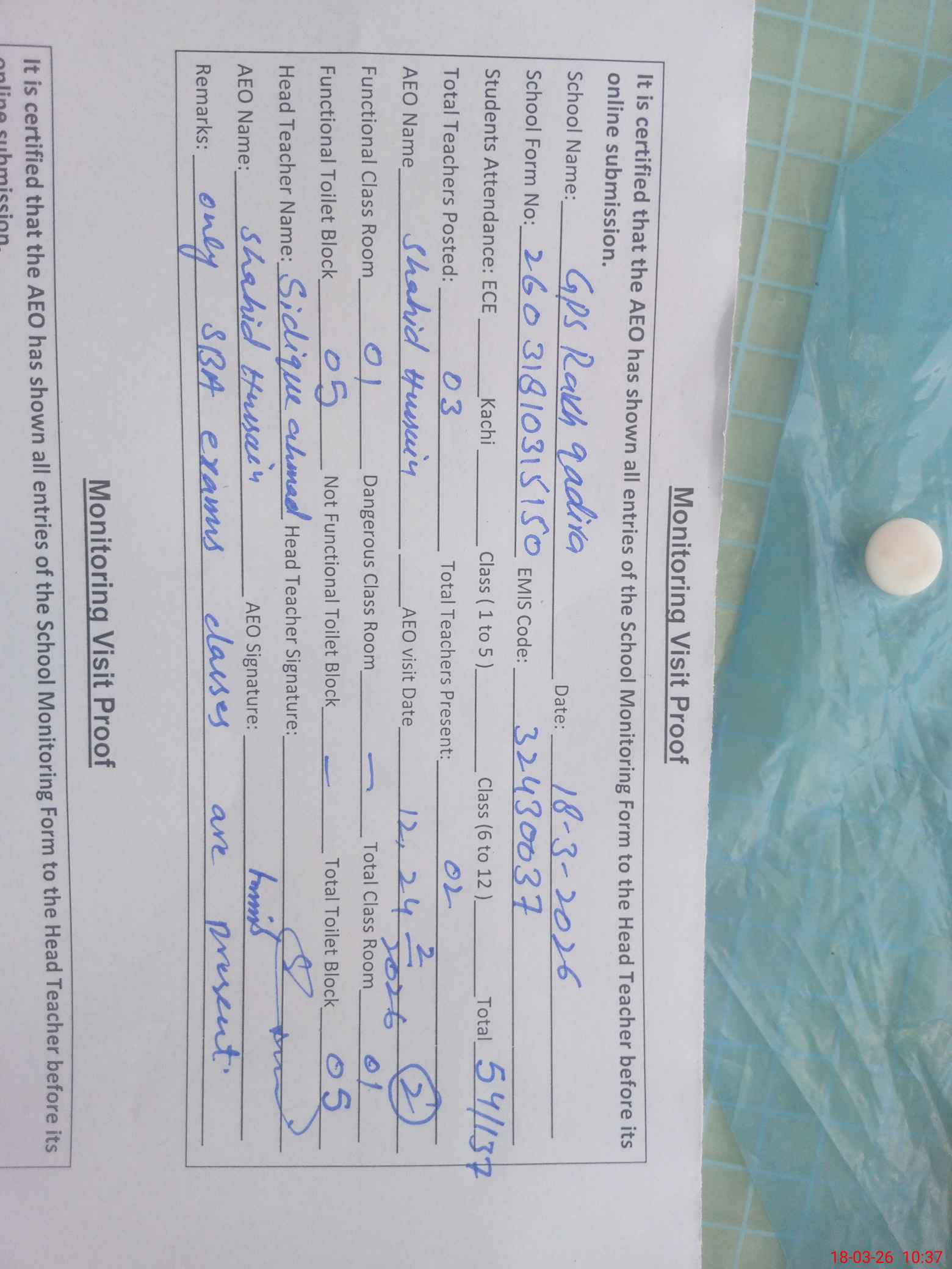 | Remarks (Use Separate Page if Required): Only Sba exams classes are present. | |||||