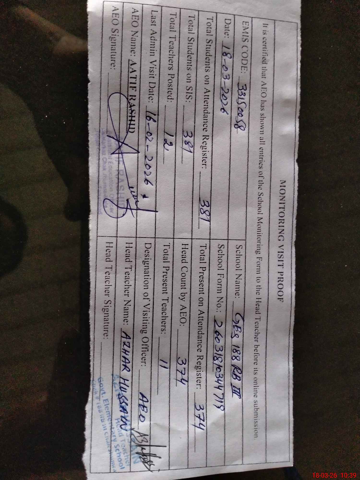 | Certified that this School was Inspected by the Undersigned MEA/DMO Today and the Information Stated Above is as Per Record. | |||||
