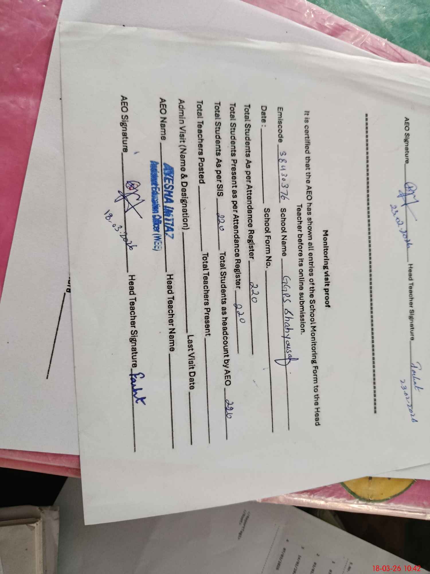 | Certified that this School was Inspected by the Undersigned MEA/DMO Today and the Information Stated Above is as Per Record. | |||||