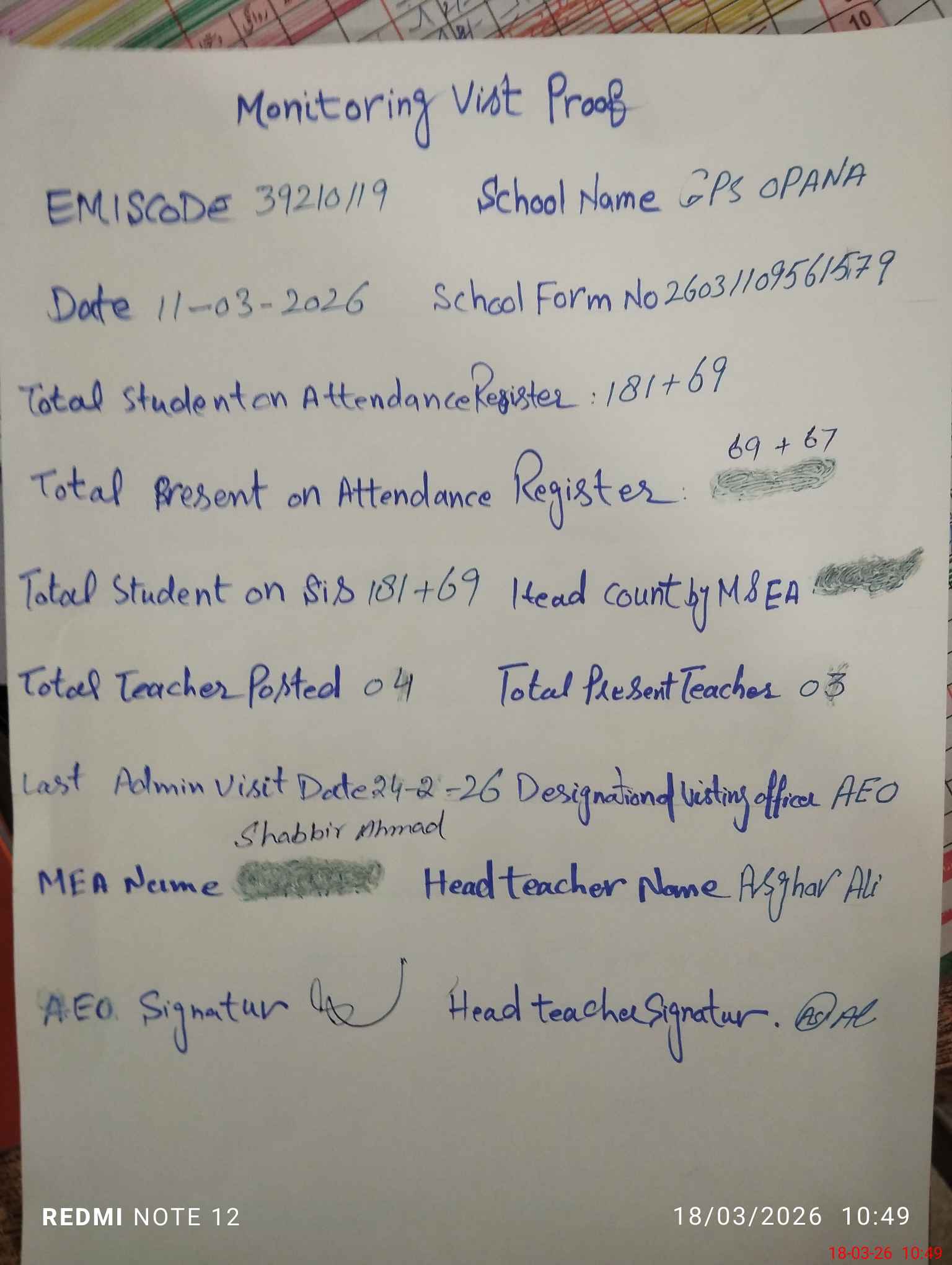 | Attendance Register | Head Teacher | MEA with School | Visit Proof |