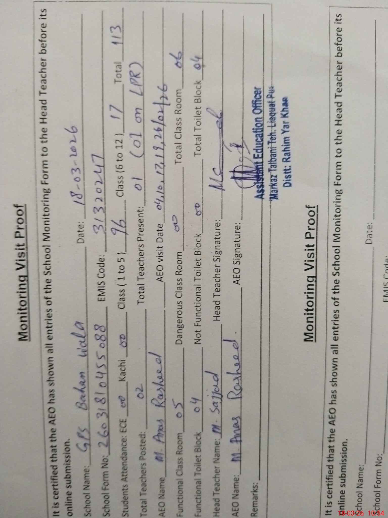 | EMIS Code: 31320247 | Name of School: GPS BAHAN WALA | |||