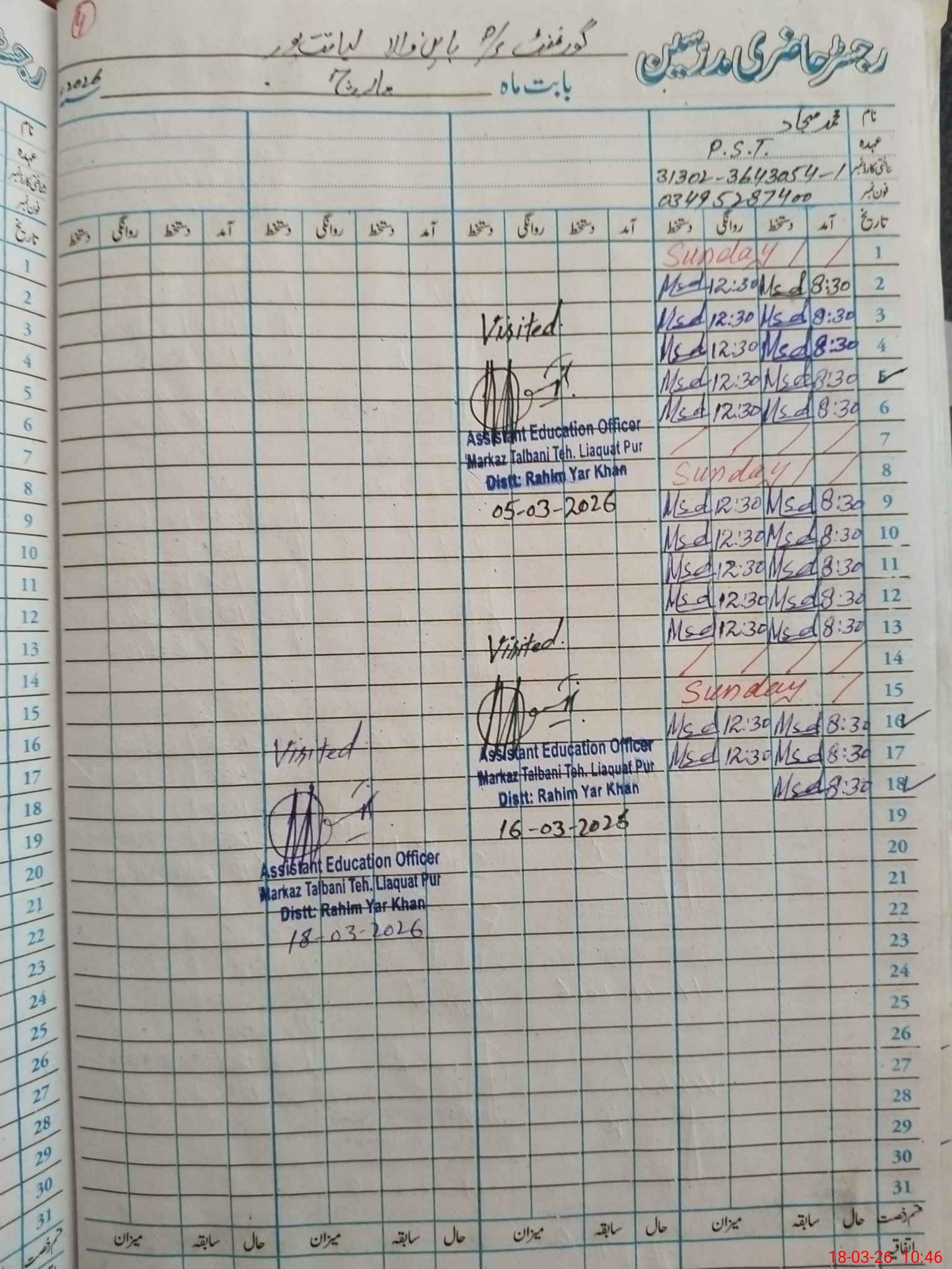 | District: RAHIMYAR KHAN | Tehsil: LIAQATPUR | Markaz: TALBANI-MALE | Level: Primary | |