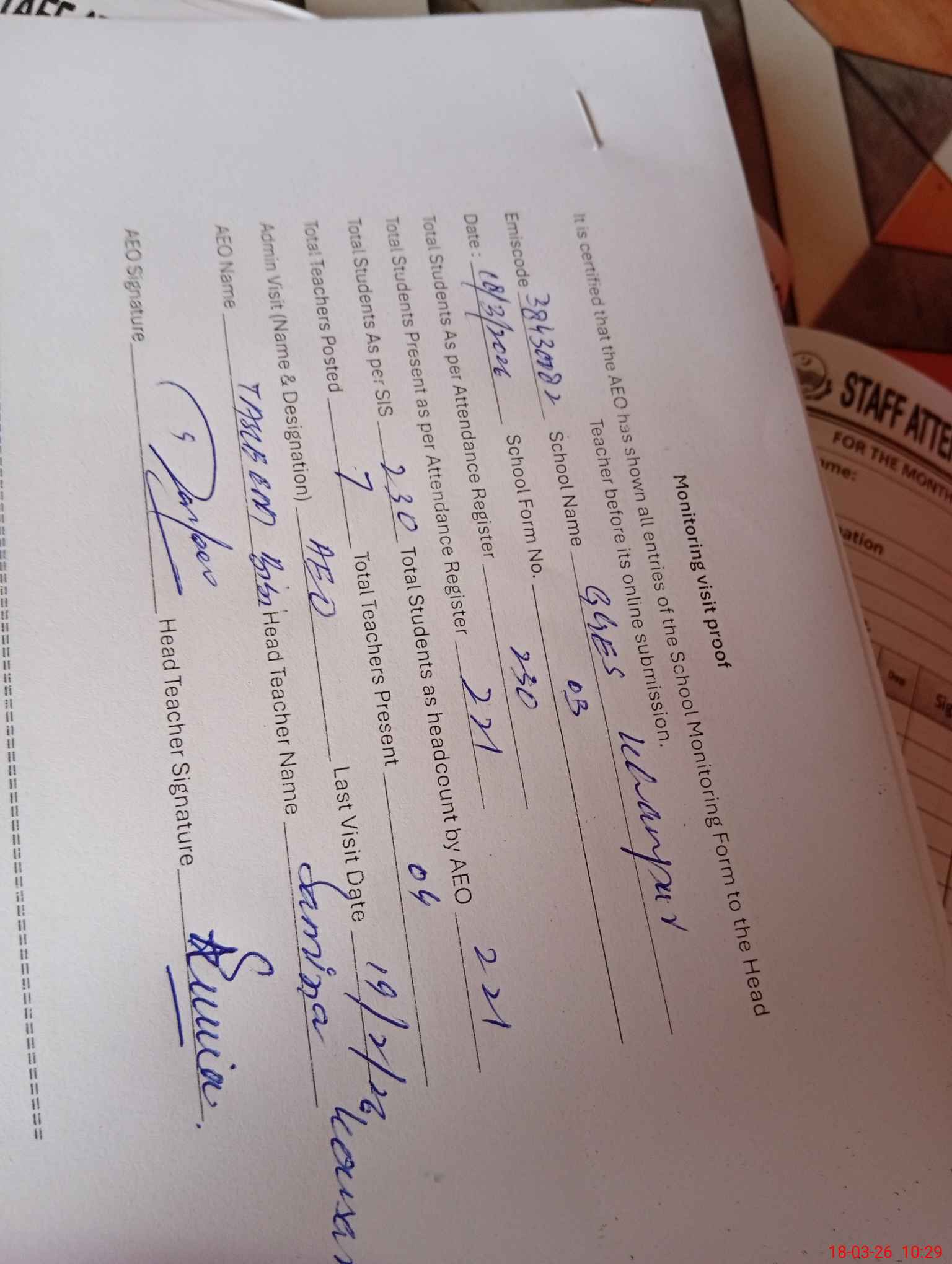 | Attendance Register | Head Teacher | MEA with School | Visit Proof |