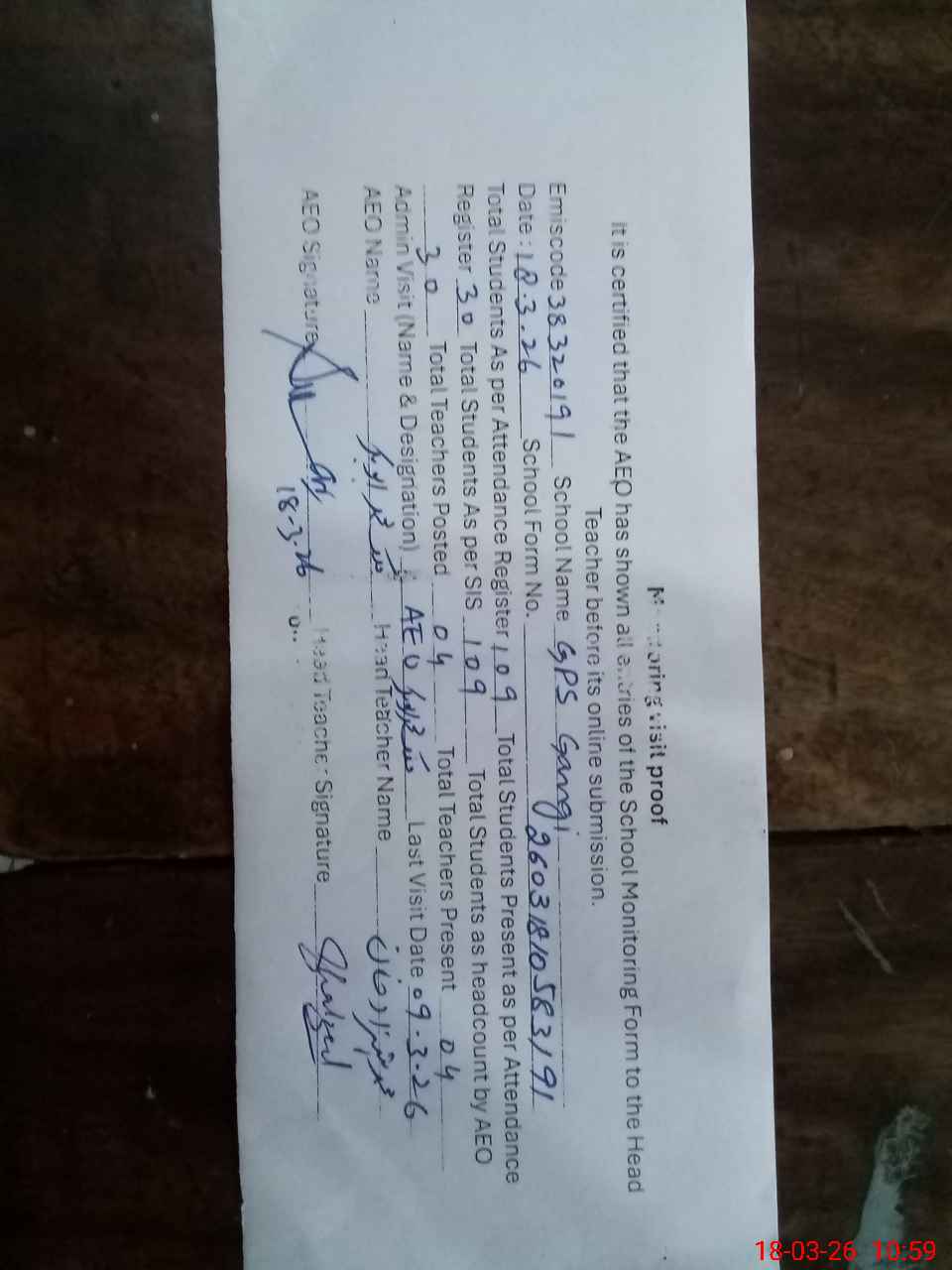 | Attendance Register | Head Teacher | MEA with School | Visit Proof |