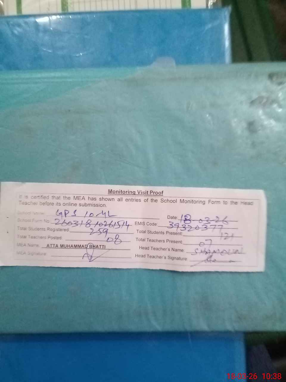 | Attendance Register | Head Teacher | MEA with School | Visit Proof |