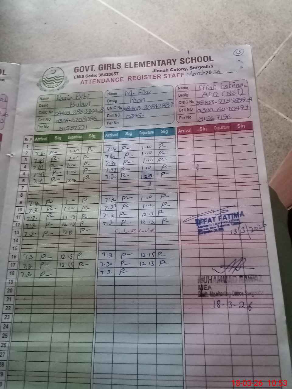 | CNIC | Full Name | Designation | R/C | Absence during last cal. month |
