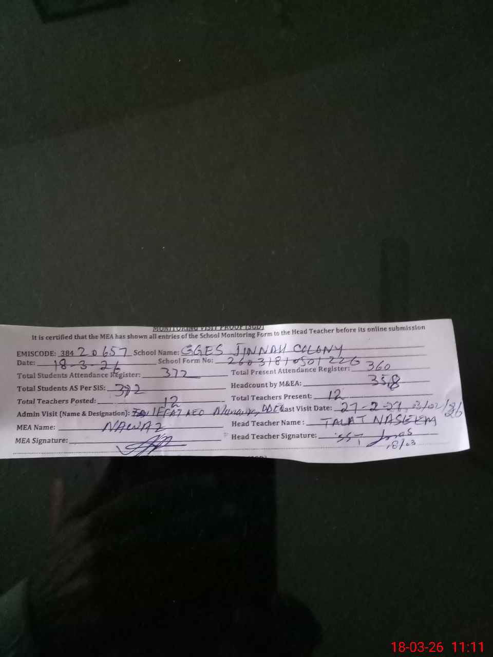 | Attendance Register | Head Teacher | MEA with School | Visit Proof |
