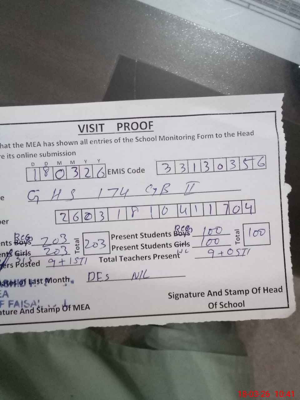 | Remarks (Use Separate Page if Required): 9th and 10th classes have 55 and 48 students admitted in school respectively but they are not present due to no exams scheduled for these classes today. ALI RAZA STI send on official duty by head teacher and entered on order book. | |||||