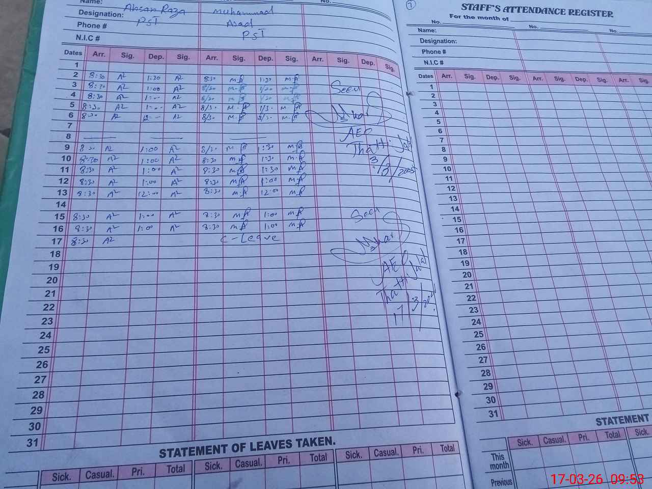 | CNIC | Full Name | Designation | R/C | Absence During Last Calender Month |