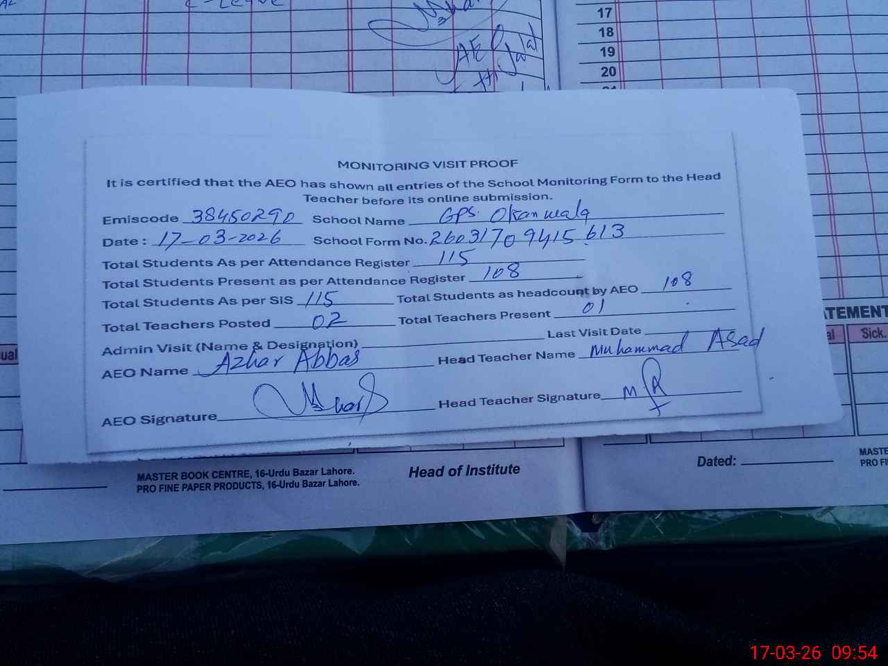 | Attendance Register | Head Teacher | MEA with School | Visit Proof |