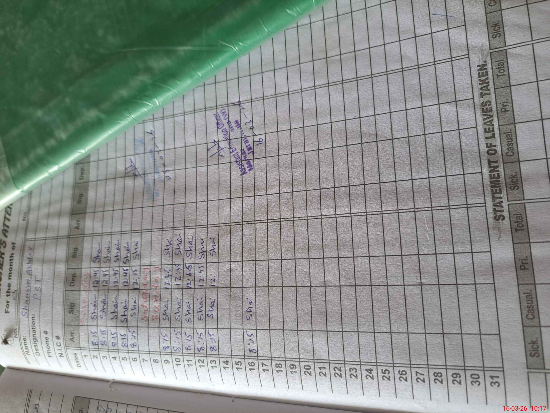 | CNIC | Full Name | Designation | R/C | Absence During Last Calender Month |