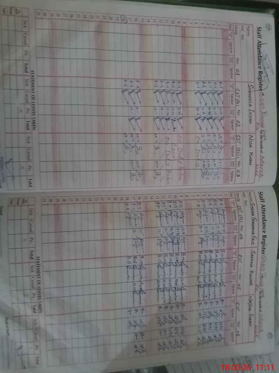 | Total no. of Classrooms: 17 No. of Classrooms Used for Teaching: 12 No. of Classrooms Storing Old Furniture, FTBs, etc: 0Comments if Any: Sir students attendance on sis not carried out Class ECCE NURSERY ONE TWO AND NINE TEN ARE ON EXAM LEAVE |