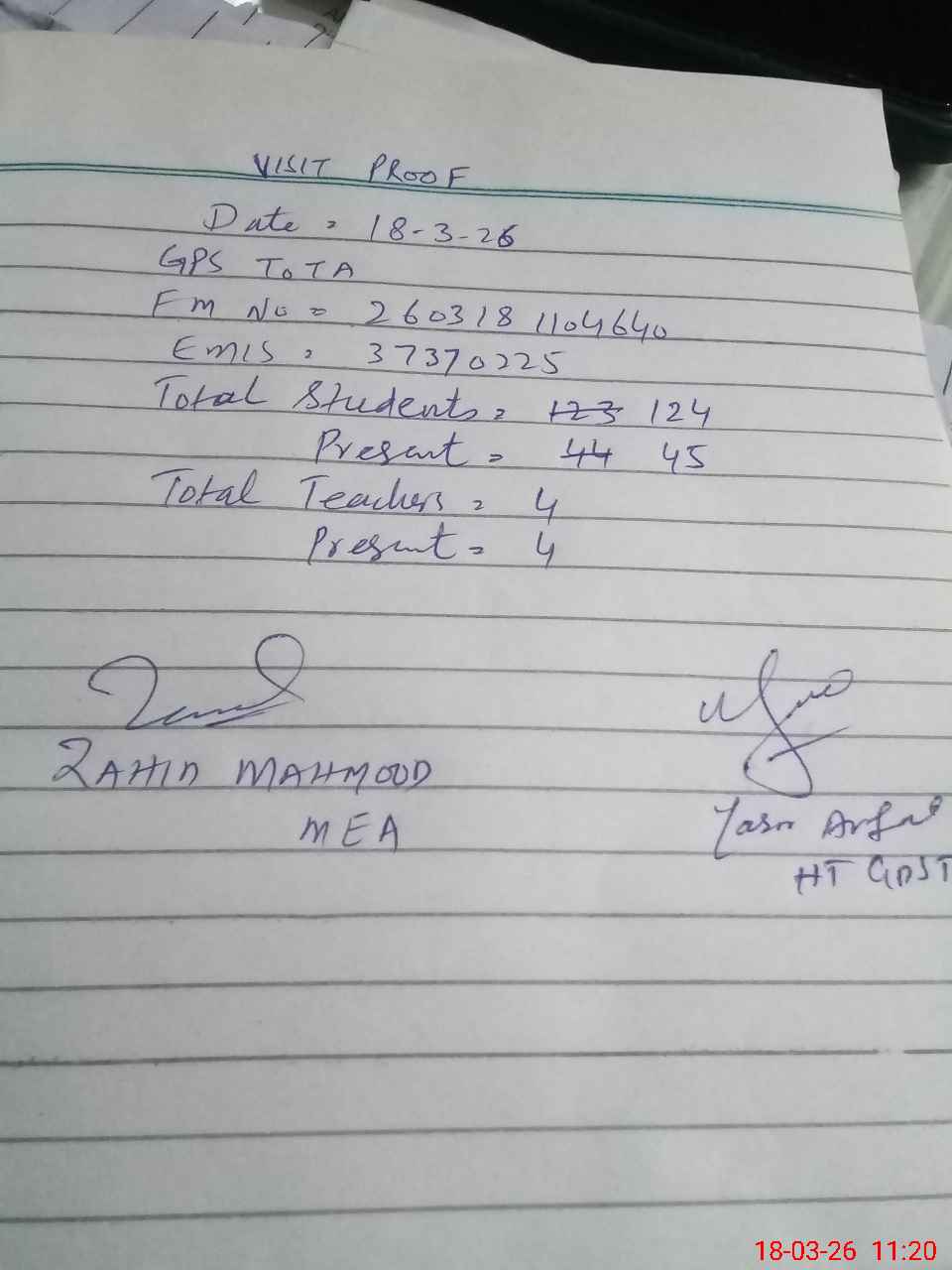 | Attendance Register | Head Teacher | MEA with School | Visit Proof |