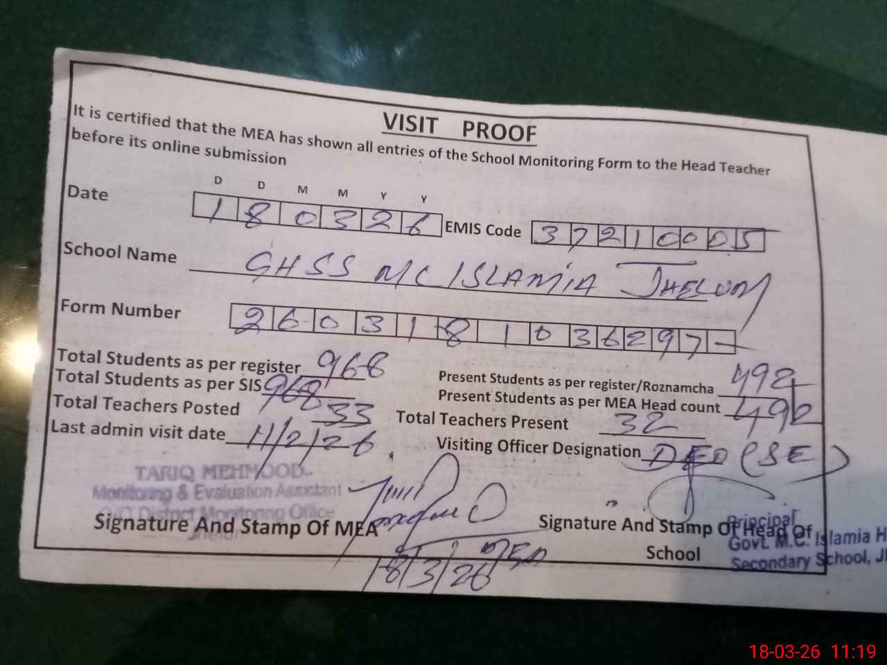 | EMIS Code: 37210005 | Name of School: GHSS MC ISLAMIA JHELUM | |||