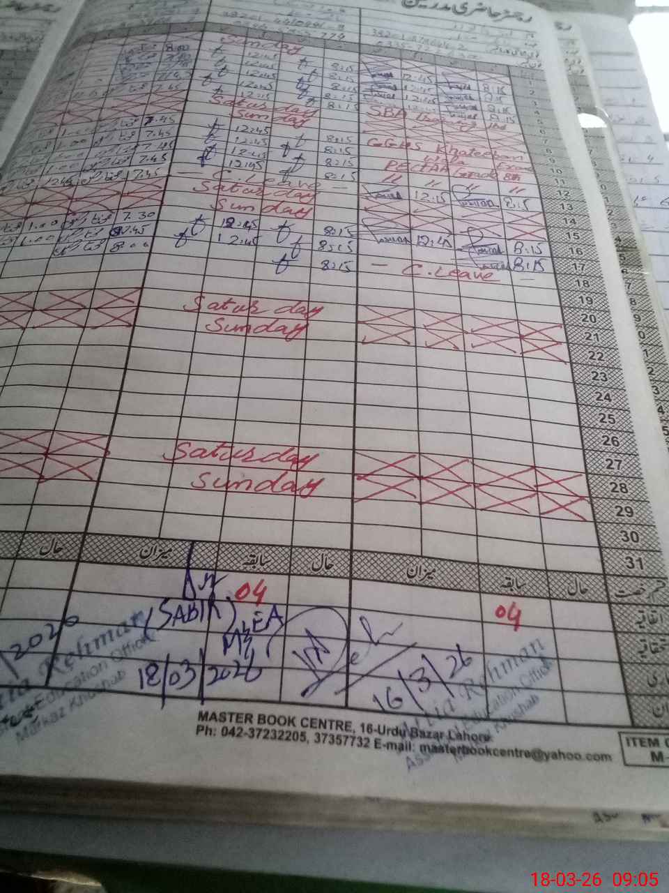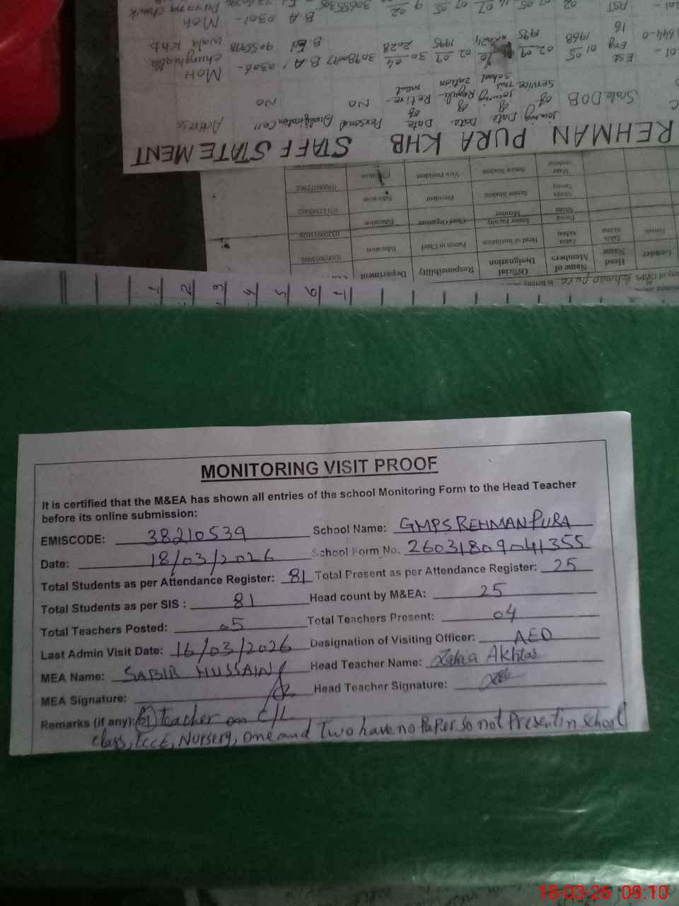 | Remarks (Use Separate Page if Required): no teacher absent total students on register 81 total students on SiS 81 last admin visit by AEO on 16 Mar 2026 class ECCE Nursery,one and two have no paper so not present in school | |||||