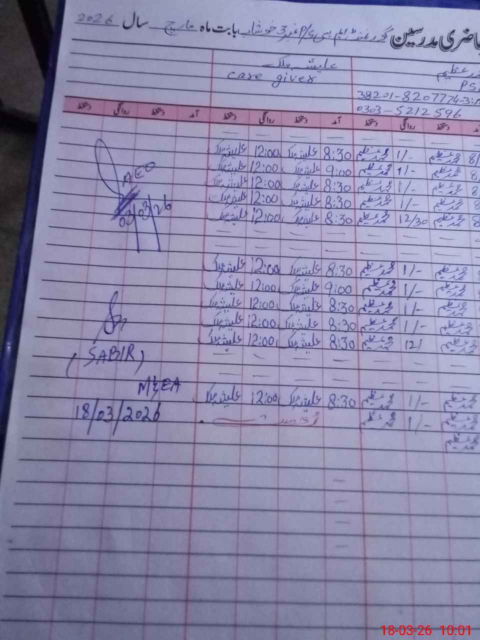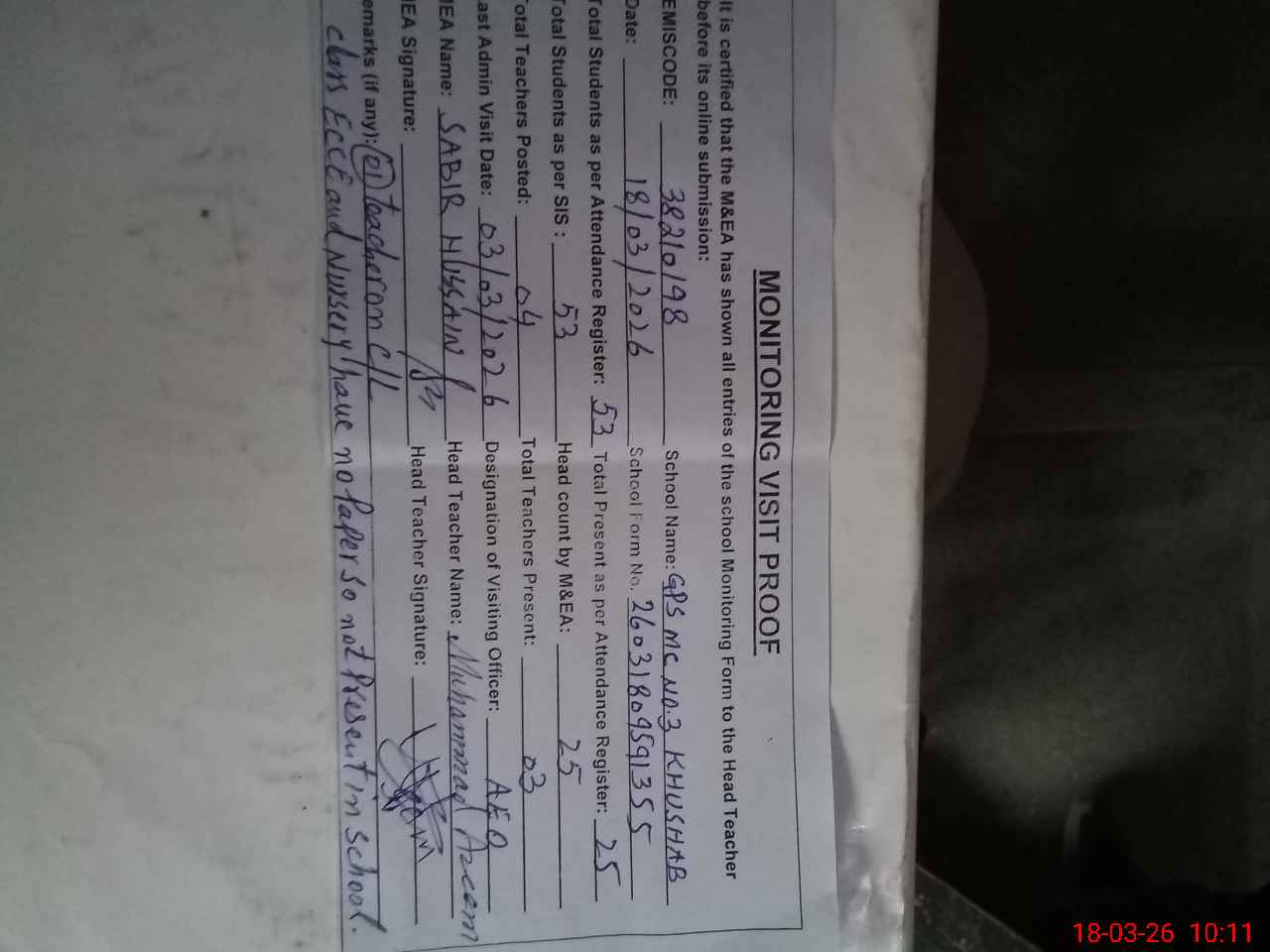 | Remarks (Use Separate Page if Required): no teacher absent total students on register 53 total students on SiS 53 last admin visit by AEO 03 Mar 2026 class ECCE and Nursery have to no paper so not present in school | |||||