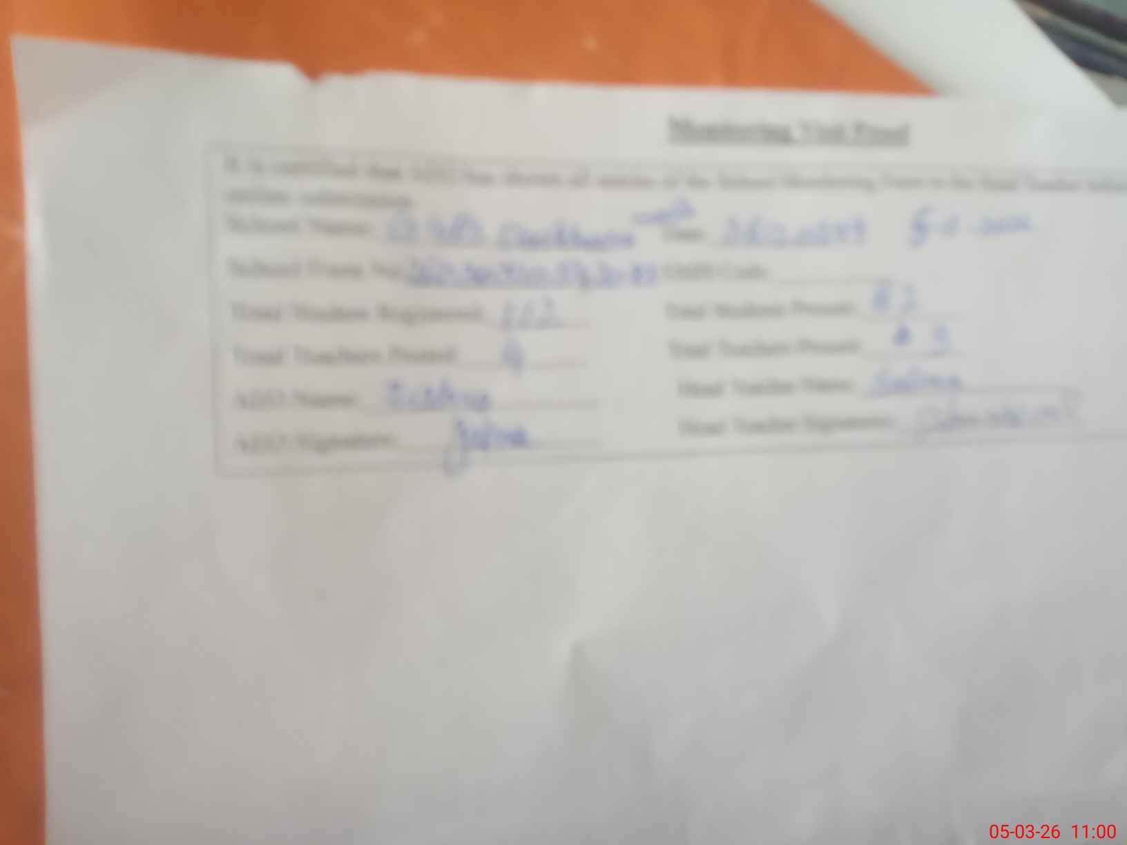 | Attendance Register | Head Teacher | MEA with School | Visit Proof |