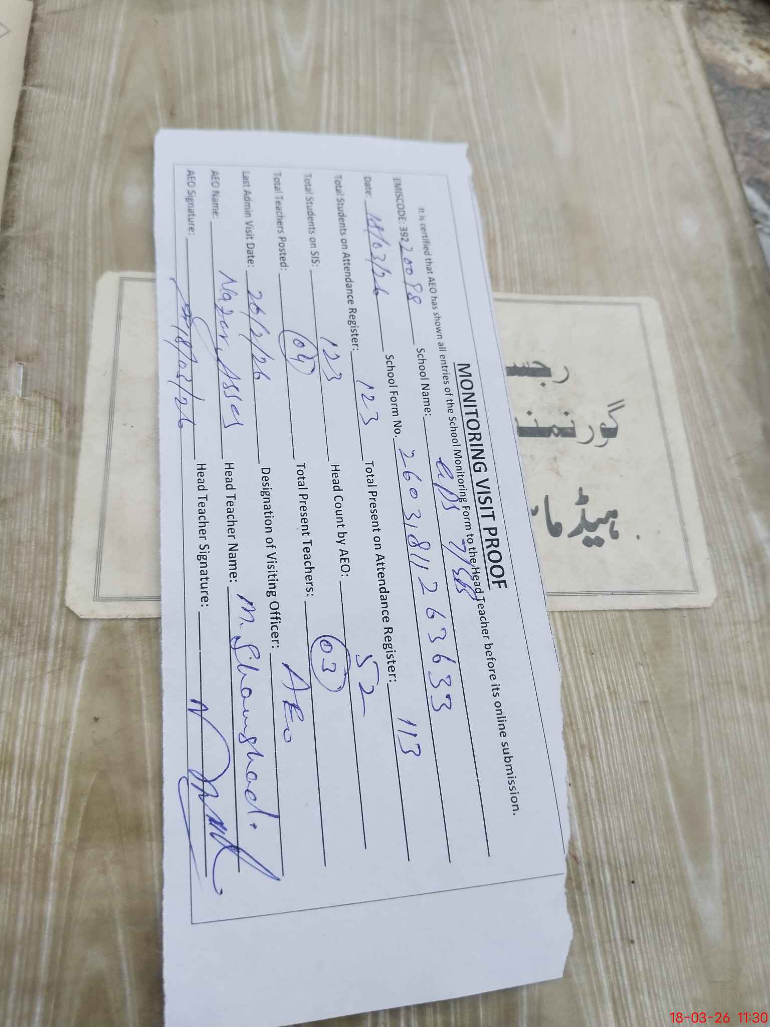 | Attendance Register | Head Teacher | MEA with School | Visit Proof |