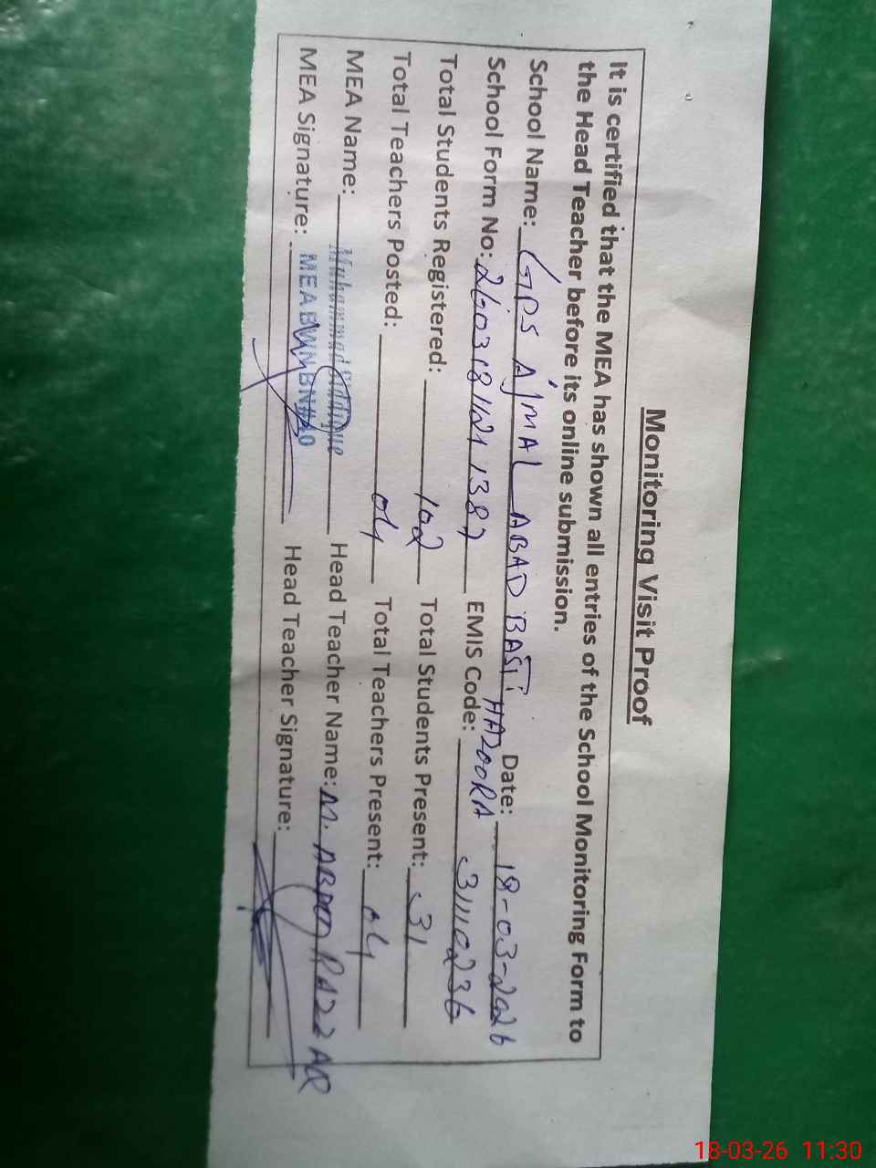 | EMIS Code: 31110236 | Name of School: GPS AJMAL ABAD (BASTI HAZOORA) | |||