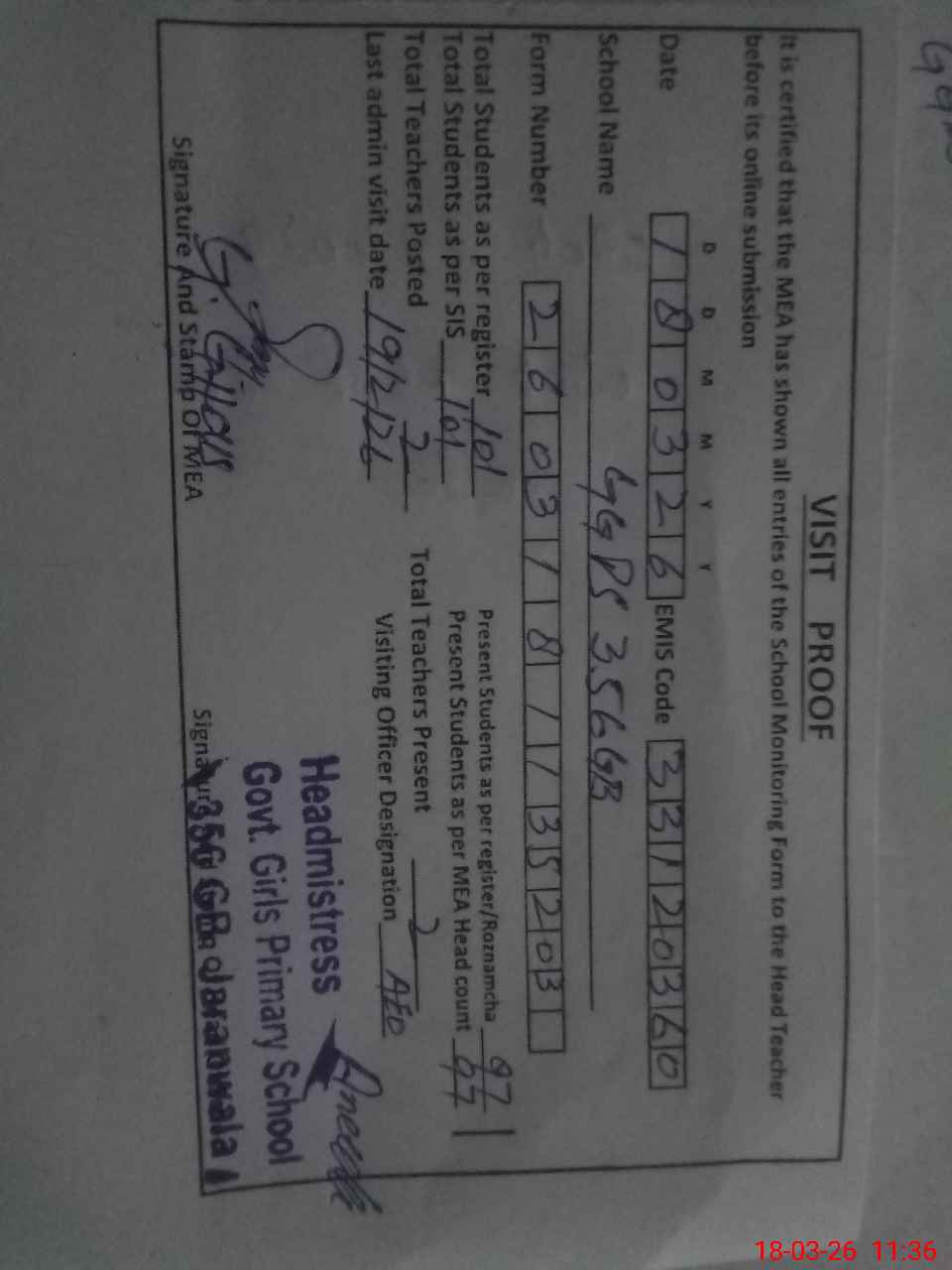 | Attendance Register | Head Teacher | MEA with School | Visit Proof |