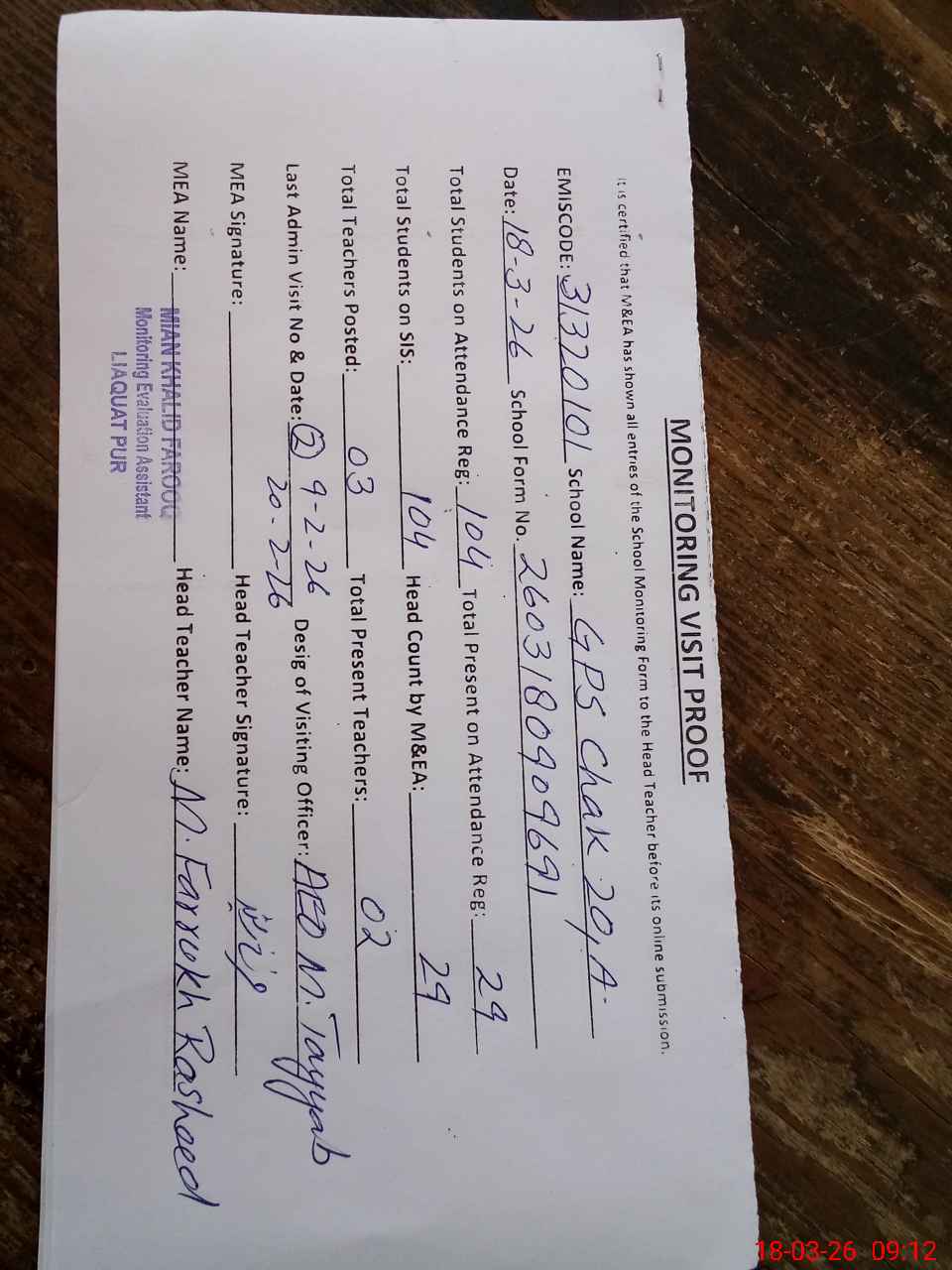 | EMIS Code: 31320101 | Name of School: GPS CHAK 20/A | |||