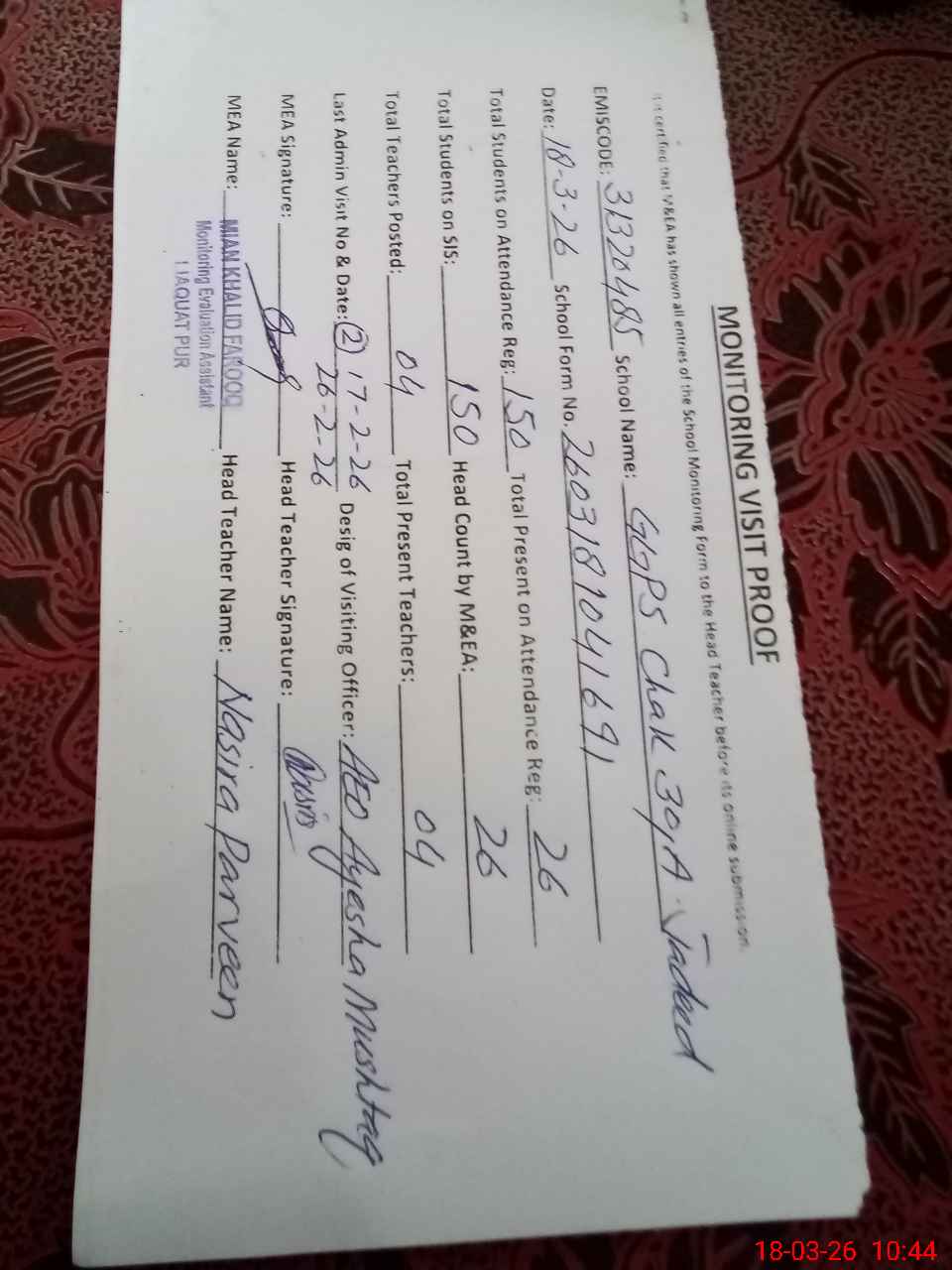 | Attendance Register | Head Teacher | MEA with School | Visit Proof |