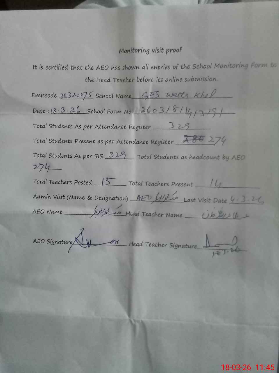 | EMIS Code: 38320075 | Name of School: GES WATTA KHEL | |||
