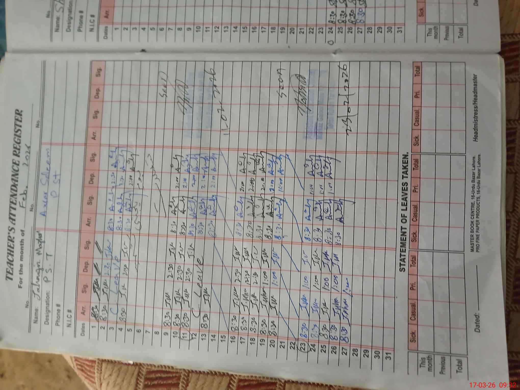 | Leave | Duty | Absent | Maternity | Medical | Ex- Pak |