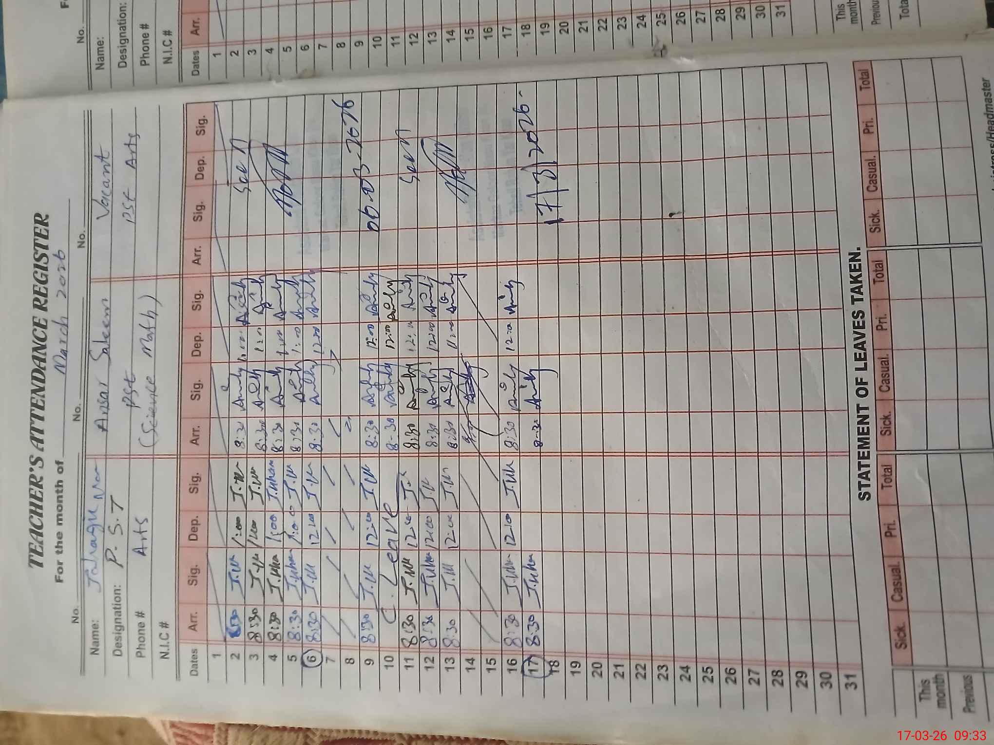 | CNIC | Full Name | Designation | R/C | Absence During Last Calender Month |