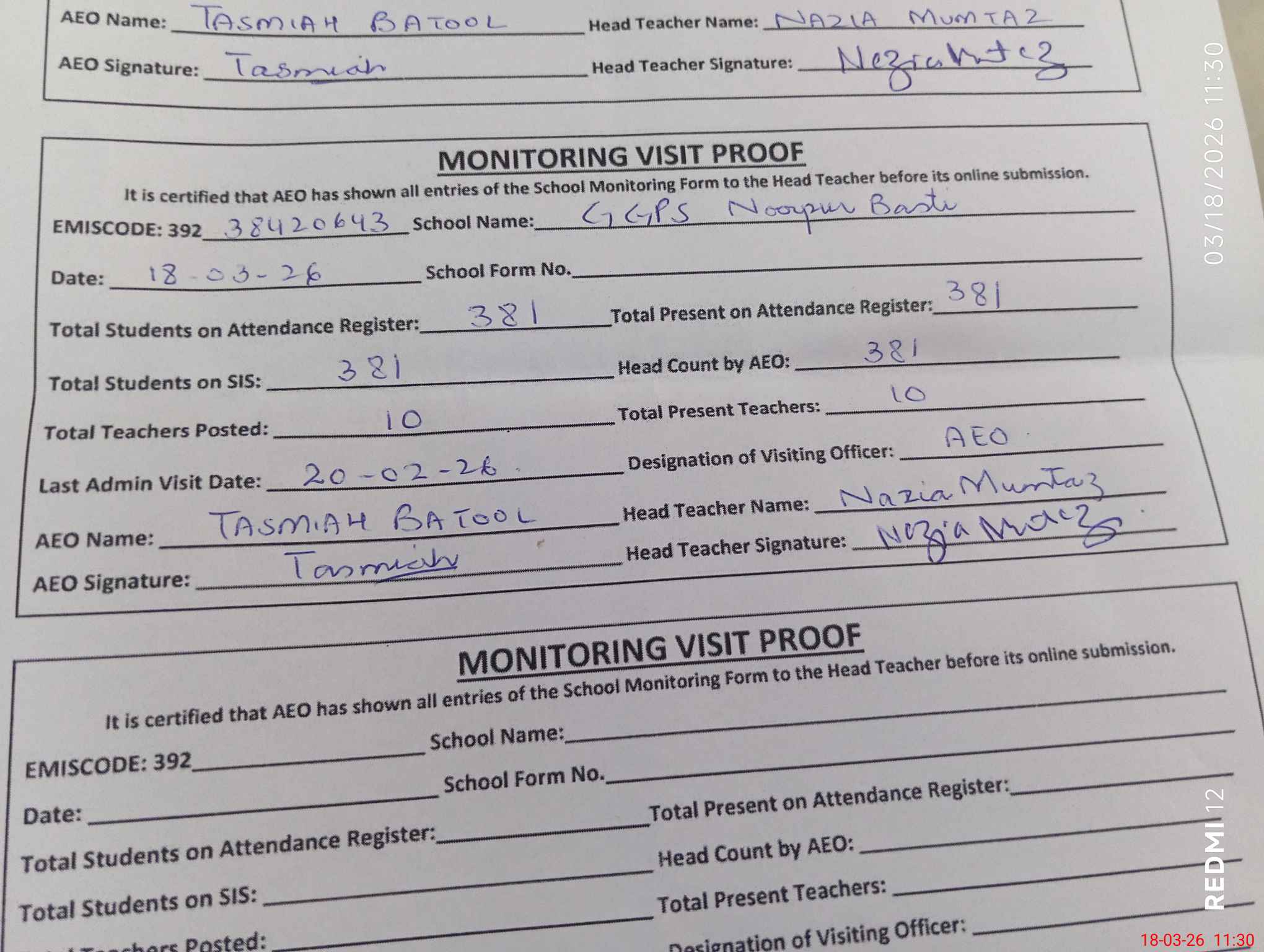 | Attendance Register | Head Teacher | MEA with School | Visit Proof |