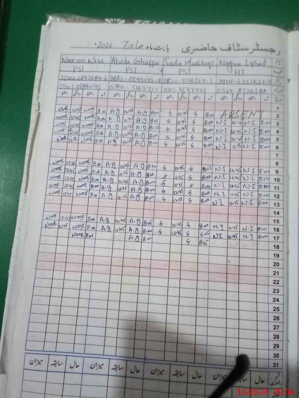 | CNIC | Full Name | Designation | R/C | Absence During Last Calender Month |