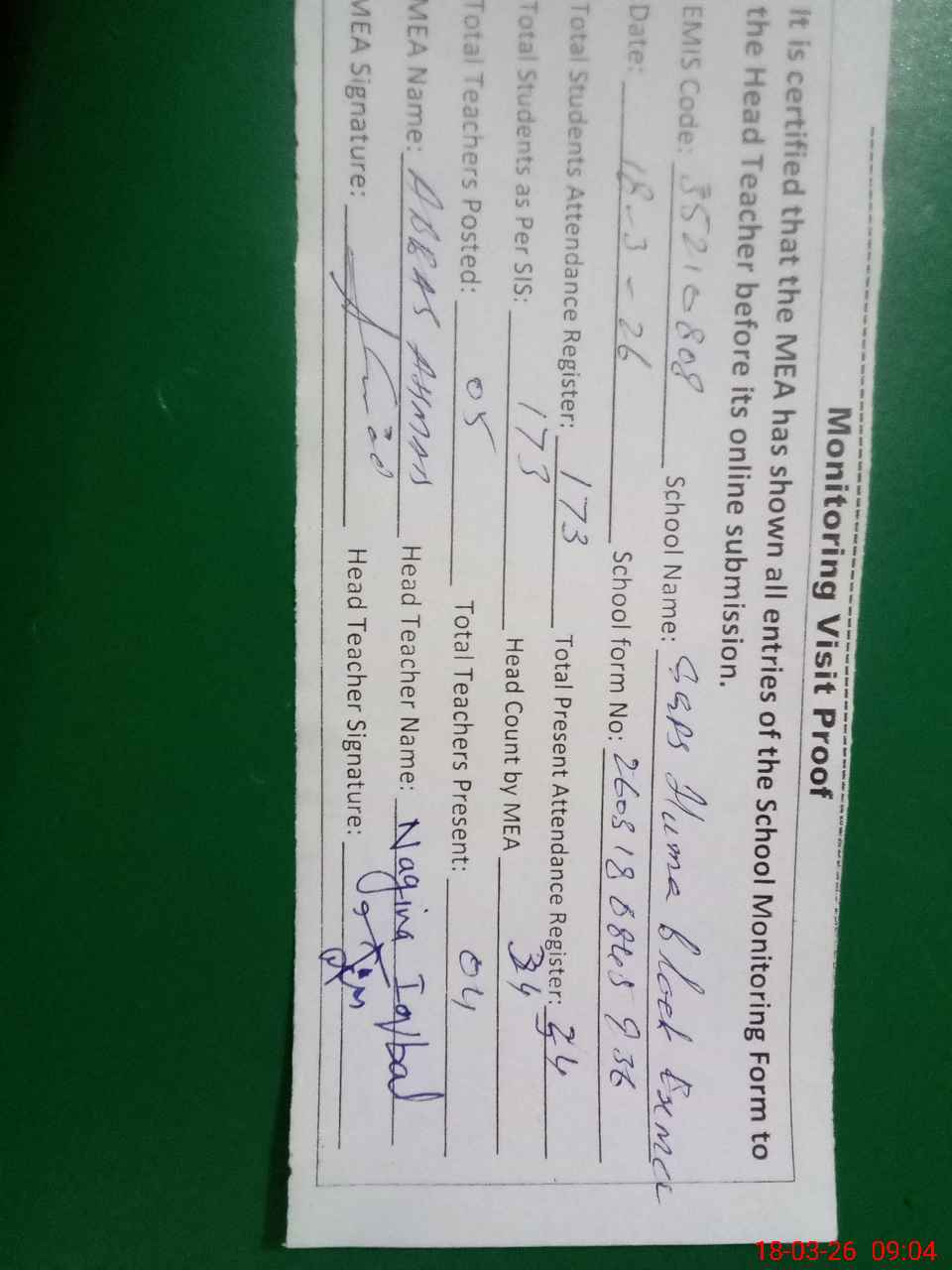 | Attendance Register | Head Teacher | MEA with School | Visit Proof |