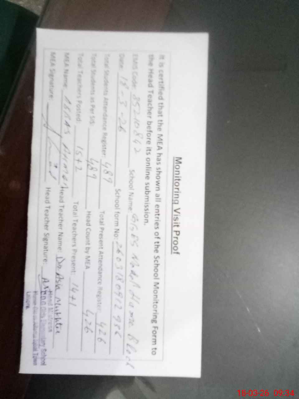 | Attendance Register | Head Teacher | MEA with School | Visit Proof |