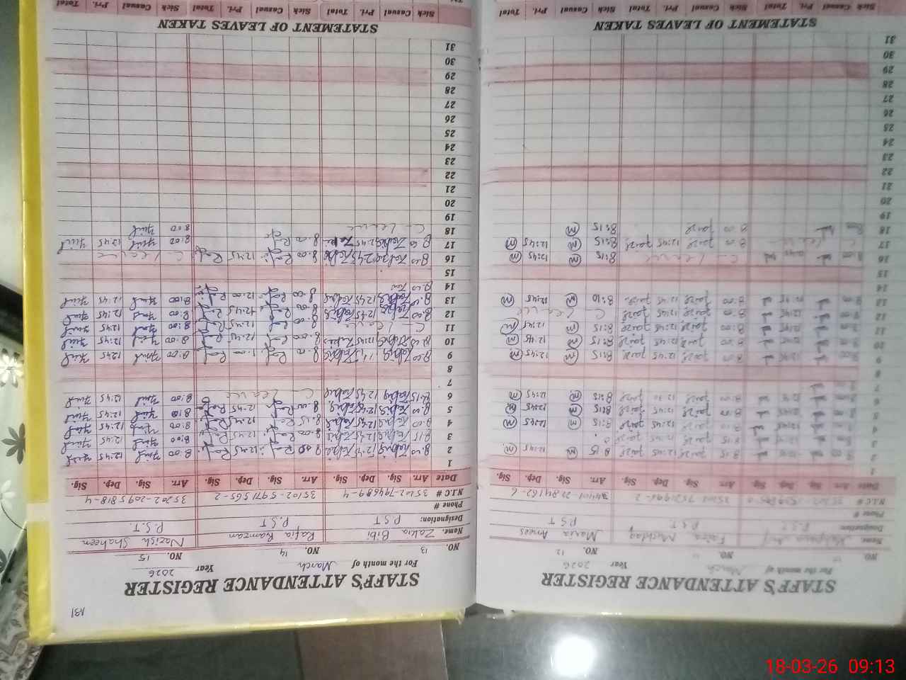 | CNIC | Full Name | Designation | R/C | Absence During Last Calender Month |