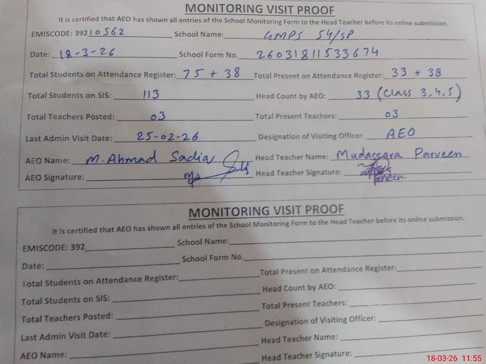 | EMIS Code: 39210562 | Name of School: GMPS 54/SP | |||