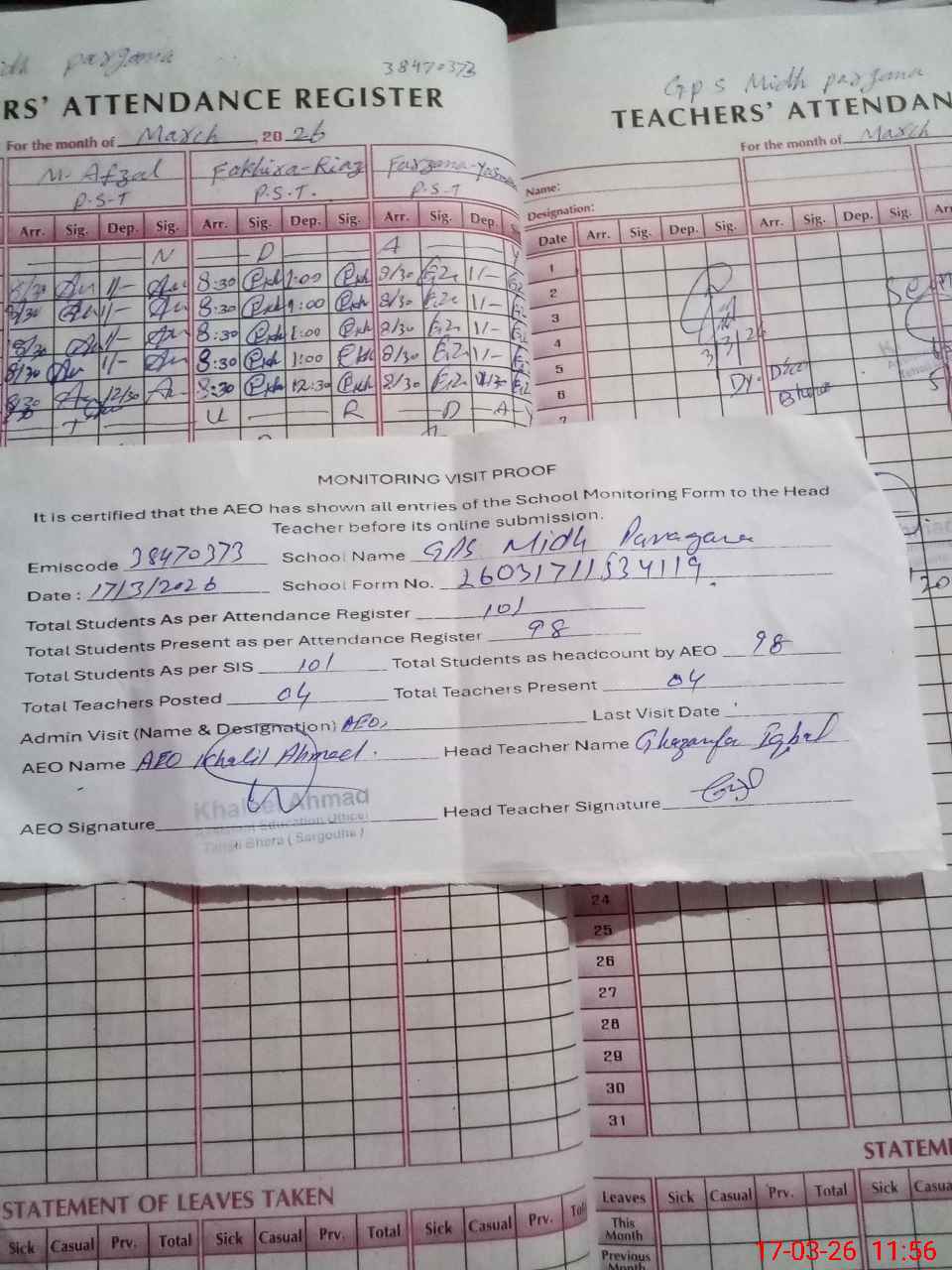 | Attendance Register | Head Teacher | MEA with School | Visit Proof |