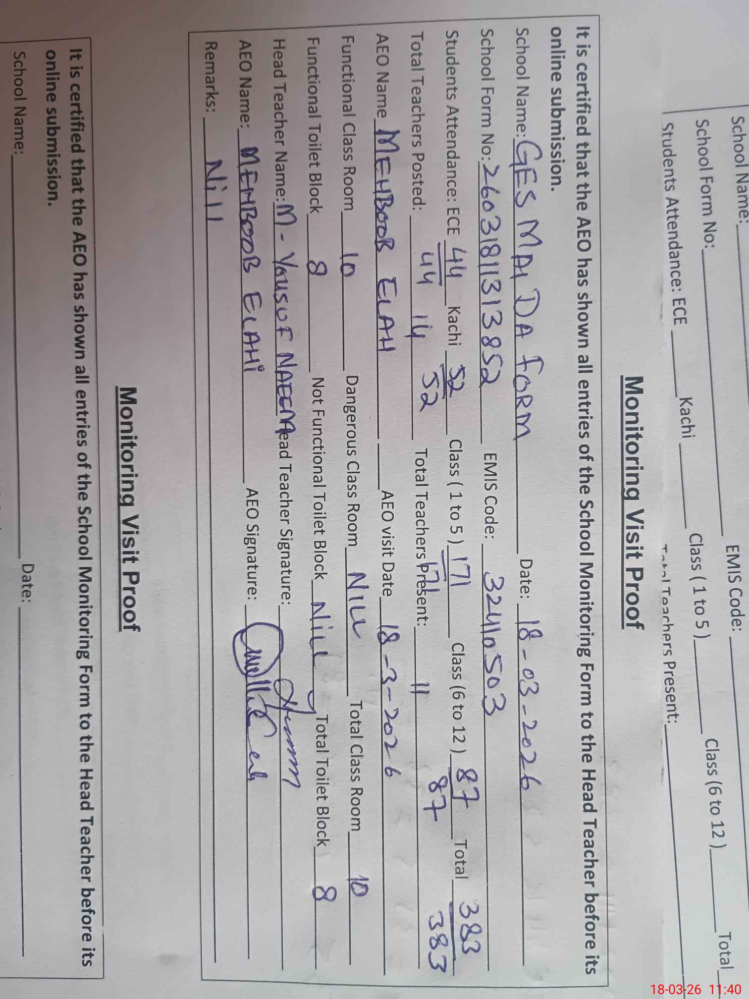 | Certified that this School was Inspected by the Undersigned MEA/DMO Today and the Information Stated Above is as Per Record. | |||||